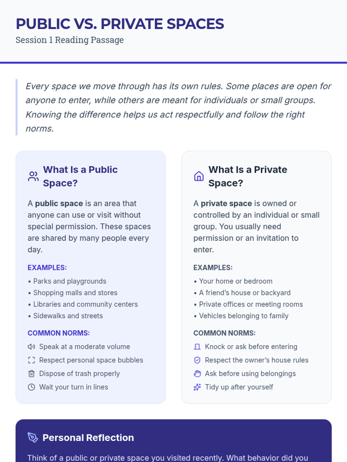A neurodiversity-affirming sequence for 6th graders to explore their personal space needs and eye contact preferences. Students learn to advocate for their own boundaries while respecting the diverse sensory and cultural needs of others through a 'User Manual' theme.