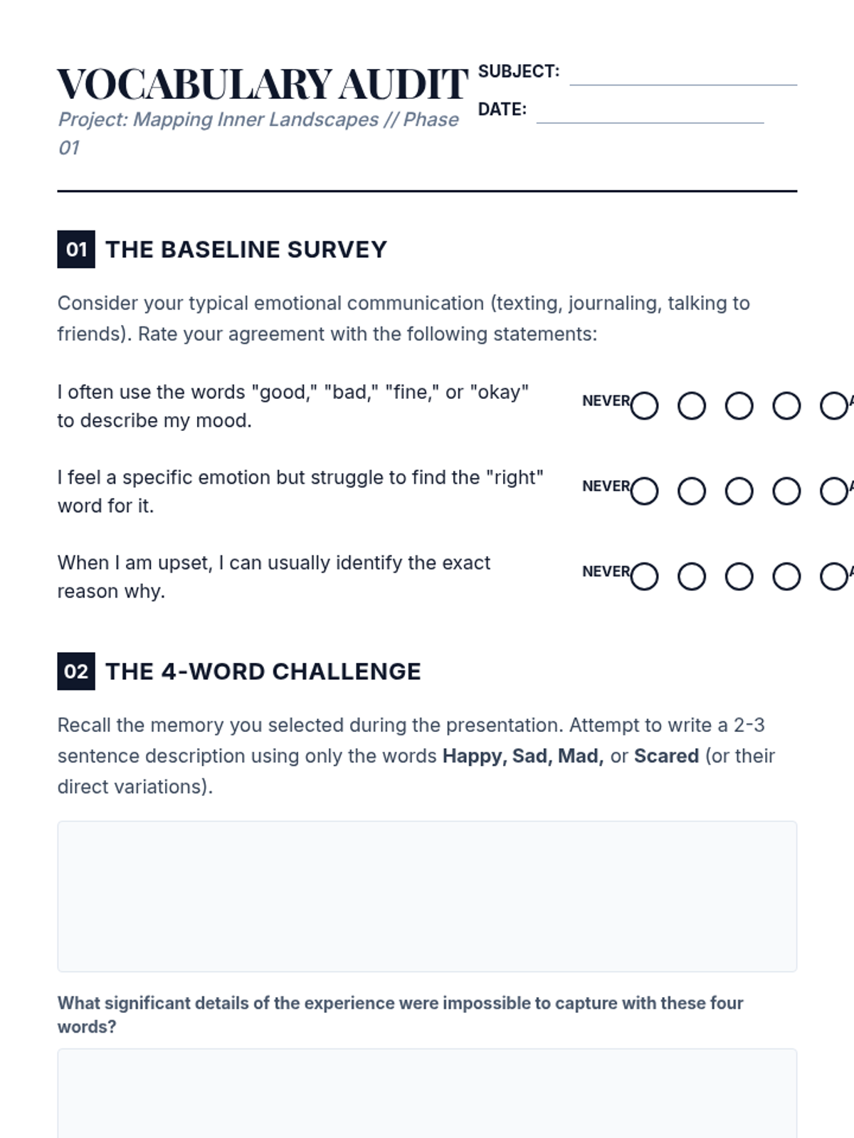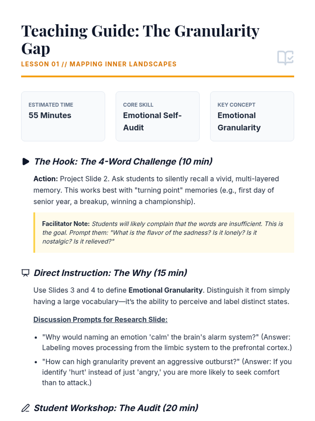 This sequence explores emotional granularity as a critical life skill for 11th-grade students. By moving from broad emotional categories to precise vocabulary, students learn to identify, differentiate, and communicate complex internal states, leveraging 'affect labeling' to improve emotional regulation and interpersonal relationships.