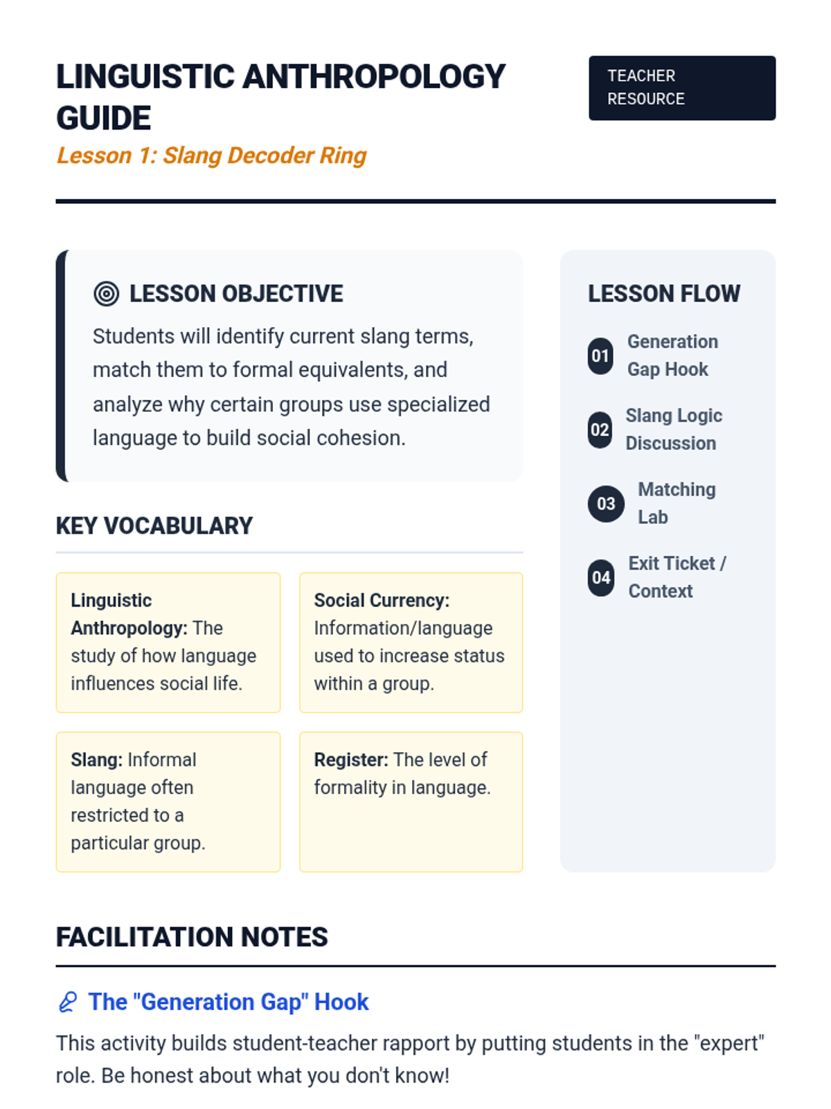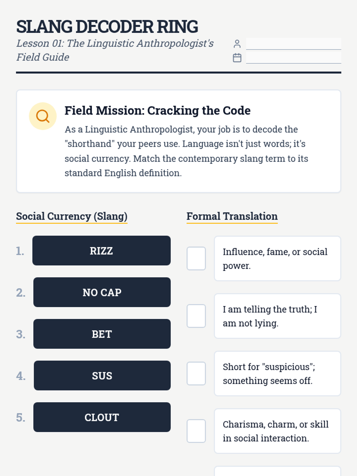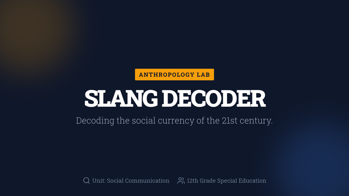 A 5-lesson sequence for 12th-grade Special Education students focusing on social communication through the lens of contemporary slang, figurative language, and code-switching. Students act as 'linguistic anthropologists' to decode social currency in peer relationships.