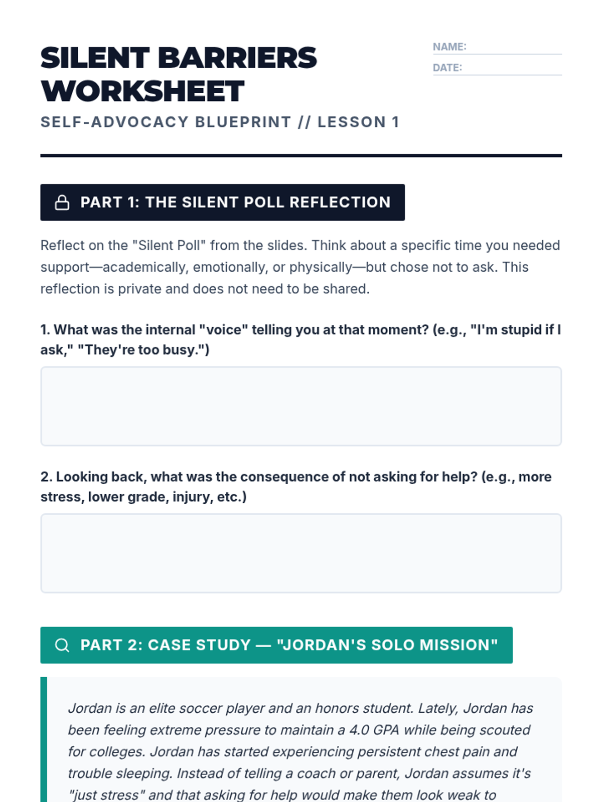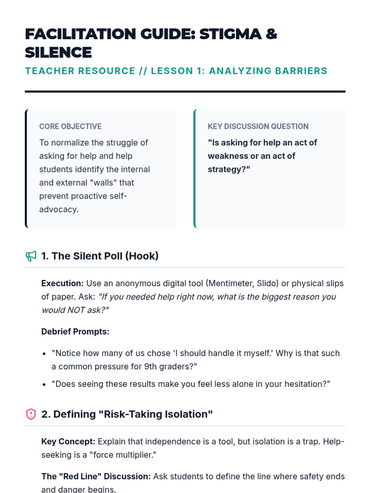 A comprehensive 5-lesson sequence for 9th-grade students focused on overcoming barriers to help-seeking, mapping support networks, mastering assertive communication, navigating healthcare systems, and establishing healthy personal boundaries.