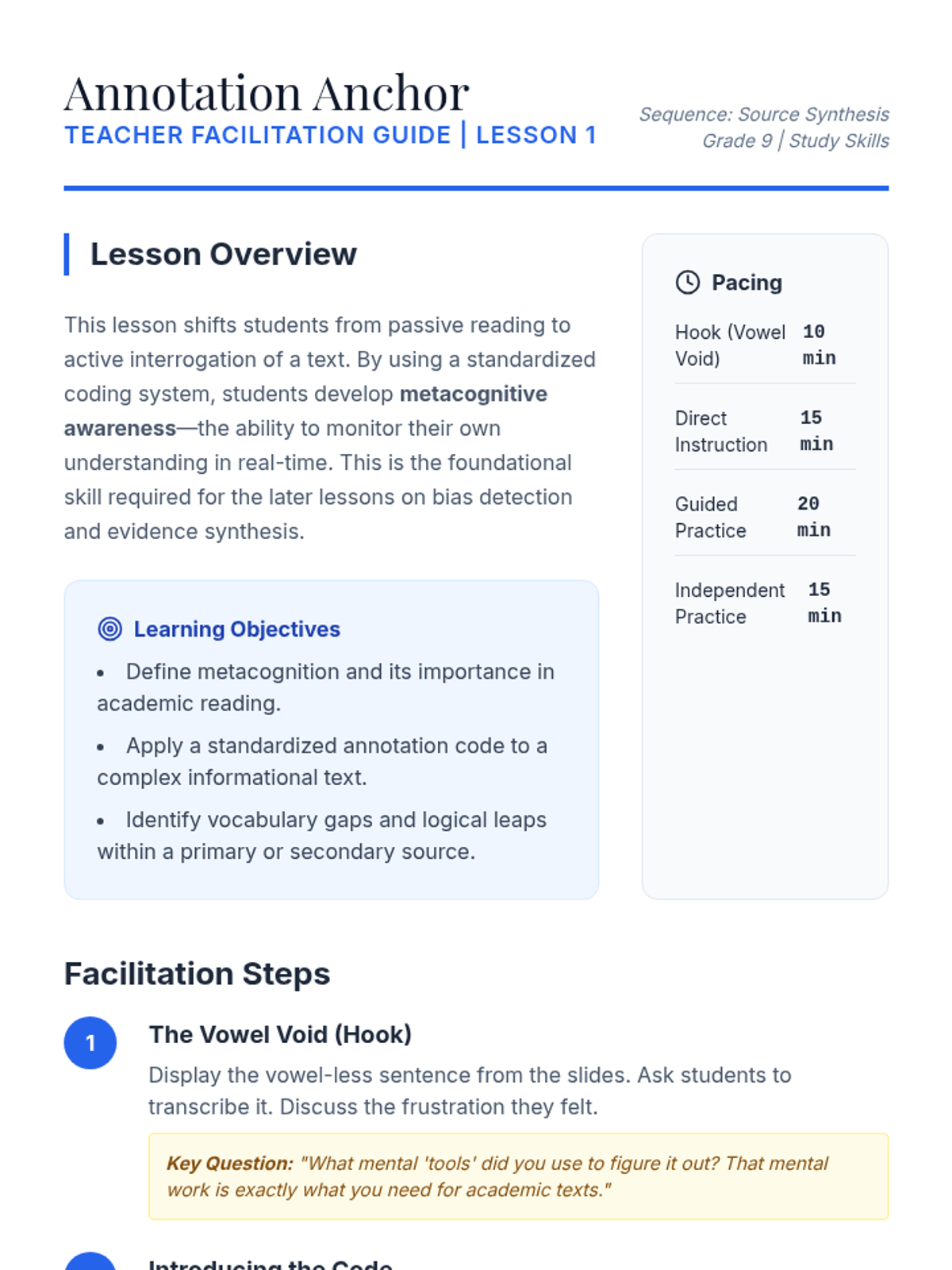 A comprehensive 9th-grade sequence focused on teaching students how to move from active reading and annotation to synthesizing information from multiple academic sources. Students will explore bias, comparative analysis, and academic integrity to produce a final synthesized written response.