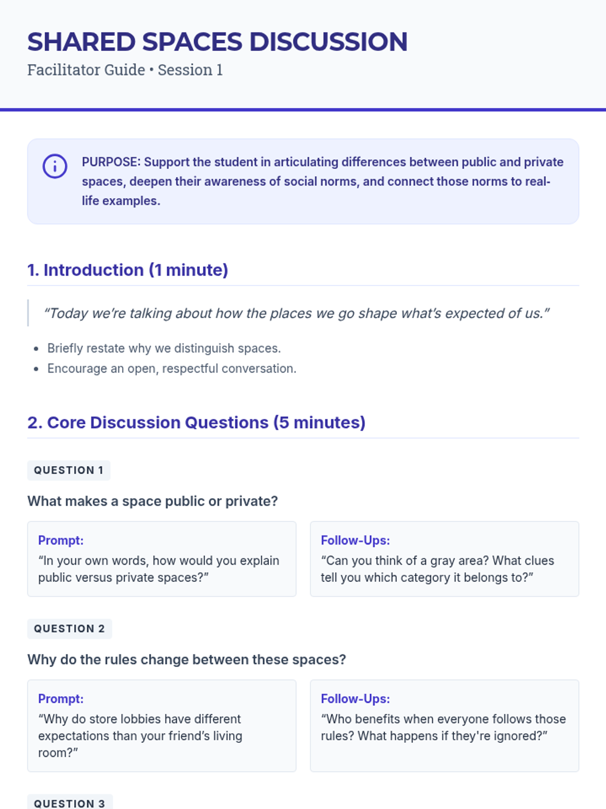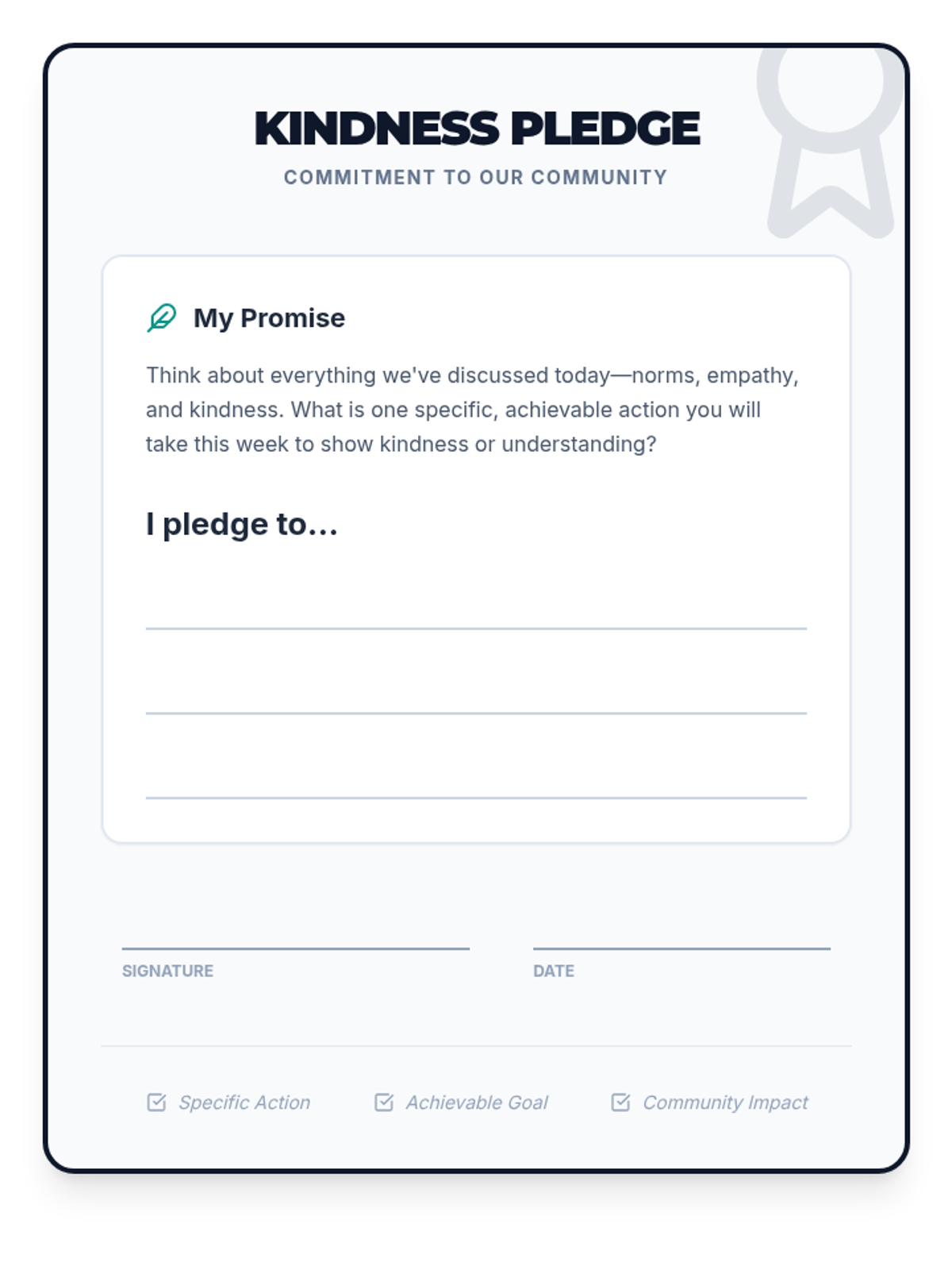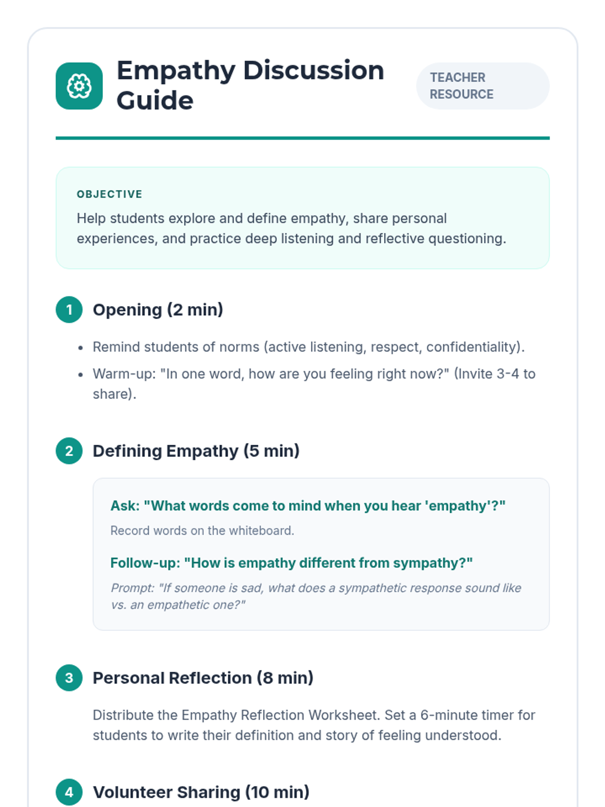 This sequence shifts the focus from individual introspection to collective well-being and leadership. Students learn to facilitate check-ins for others, developing empathy and active listening skills required for leadership roles. The arc explores the psychology of psychological safety, how to spot distress in peers, and how to build a supportive community culture. Students move from participants to facilitators, eventually leading community circles or peer support groups.