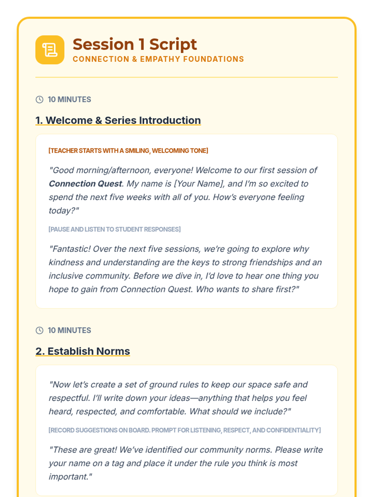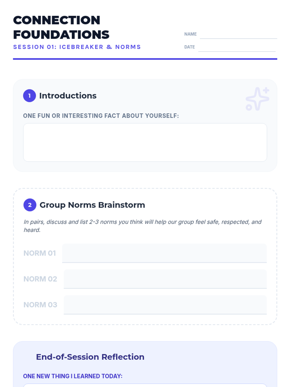 A comprehensive 6-session individual support program for students navigating cultural adjustment, immigrant-related stress, and grief. The sequence focuses on building resilience, honoring cultural identity, and fostering social connections through reflective and interactive activities.