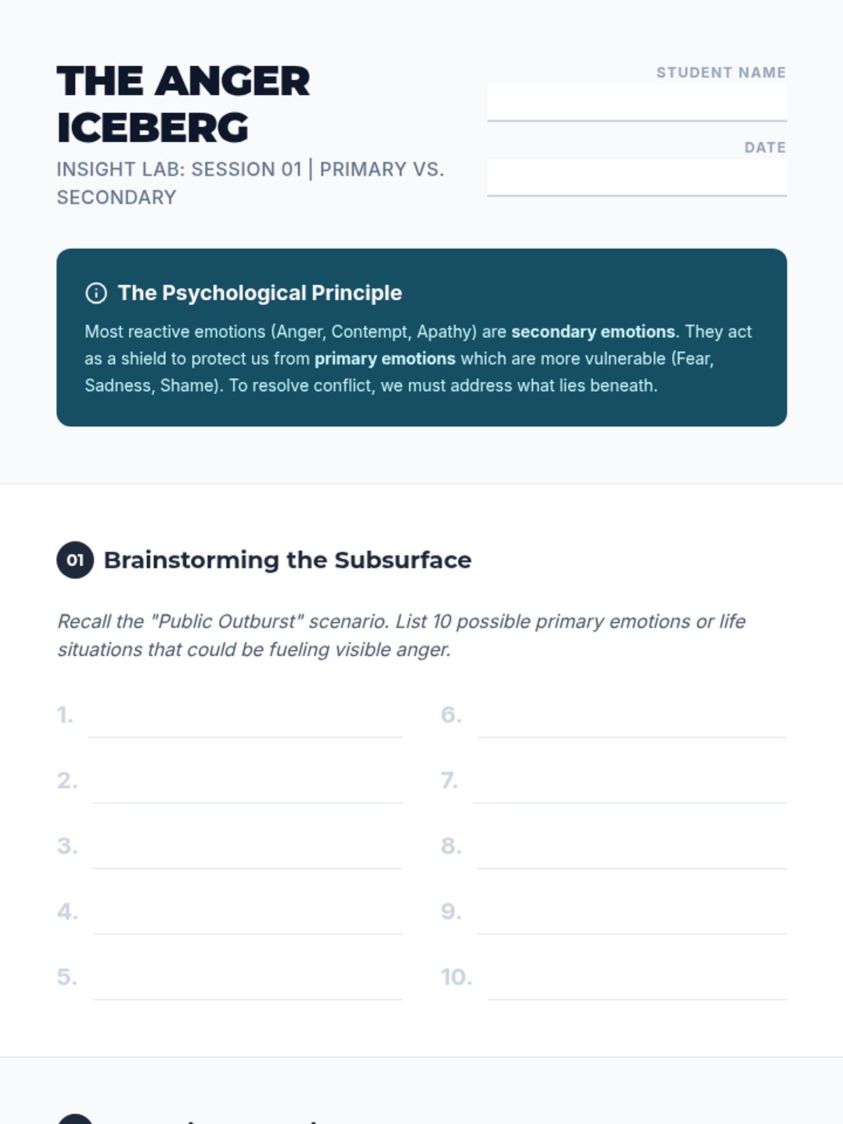 A six-session individual support plan for a 16-year-old student to understand anger, learn psychoeducation about emotions, and practice effective coping skills. This Tier 3 plan combines guided discussions, targeted activities, and worksheets to build self-awareness and regulation.