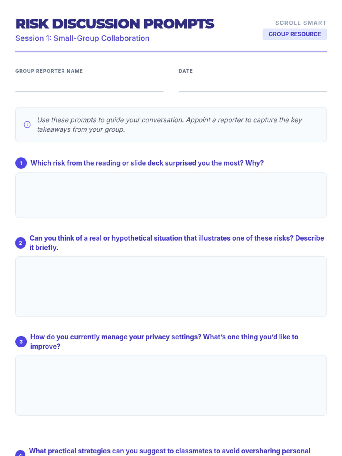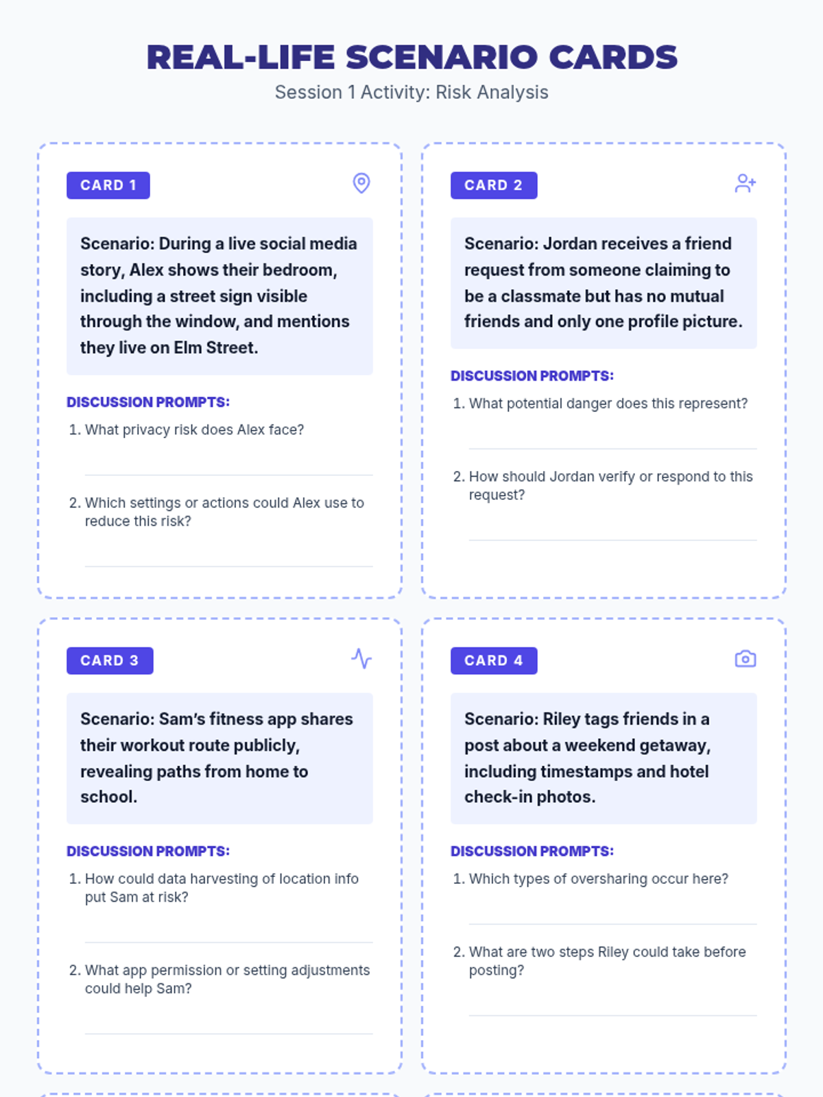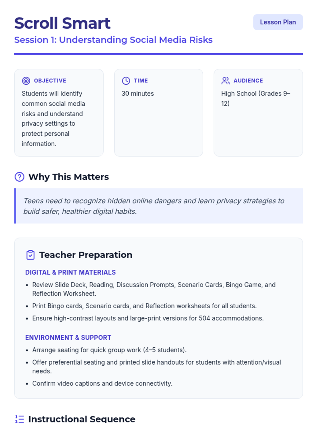 A two-session lesson sequence for high school students focused on recognizing social media risks, protecting privacy, and fostering positive digital communities through interactive games, scenarios, and reflections.