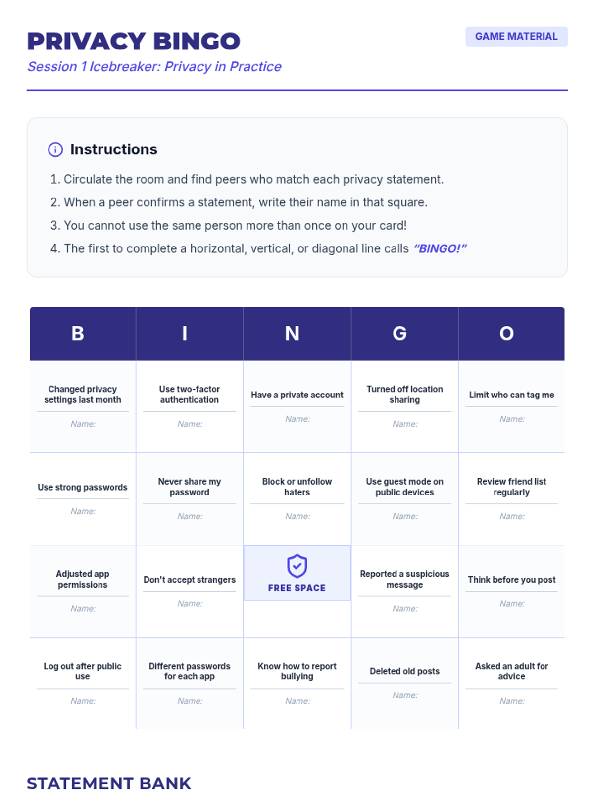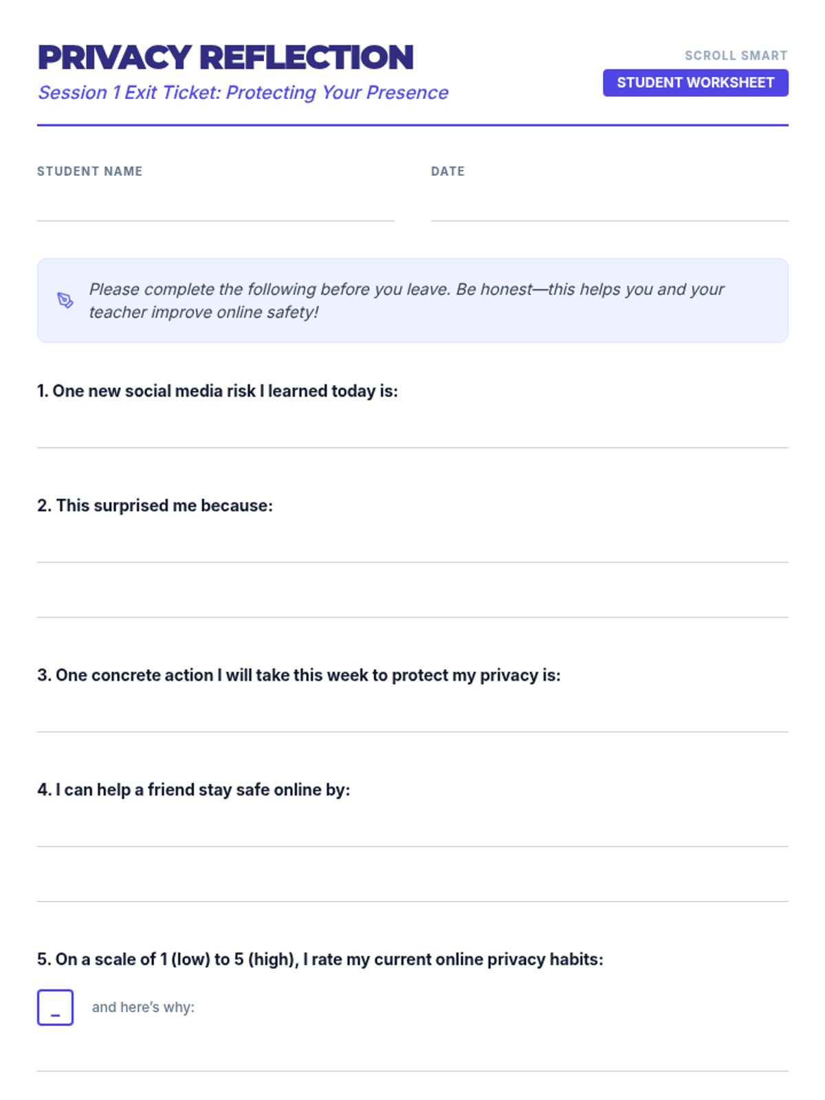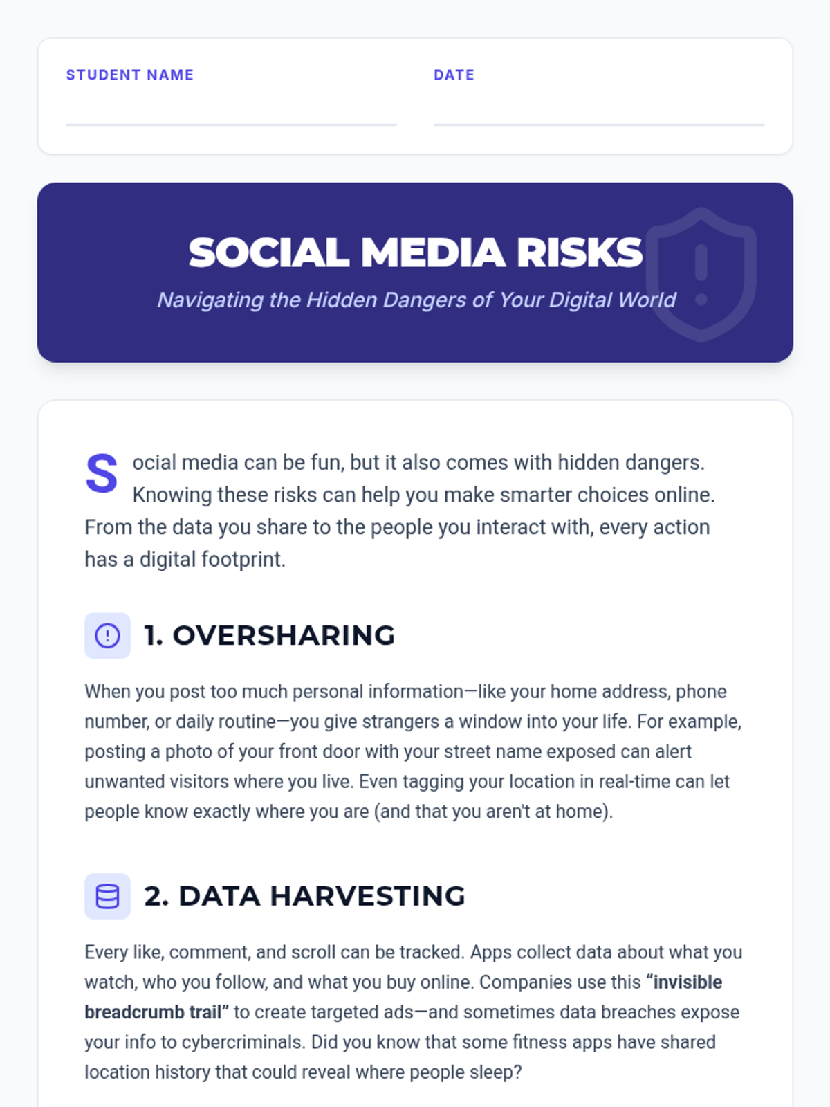 A two-session lesson sequence for high school students focused on recognizing social media risks, protecting privacy, and fostering positive digital communities through interactive games, scenarios, and reflections.