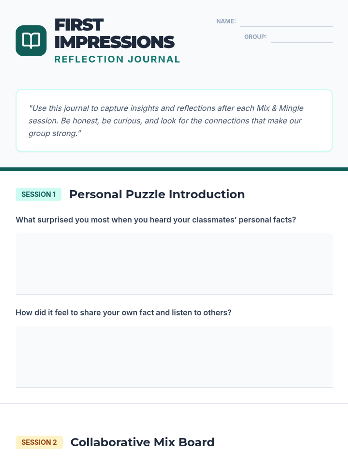 A four-part small-group icebreaker sequence designed for high schoolers to build social skills and community through collaborative puzzles and reflective journaling.