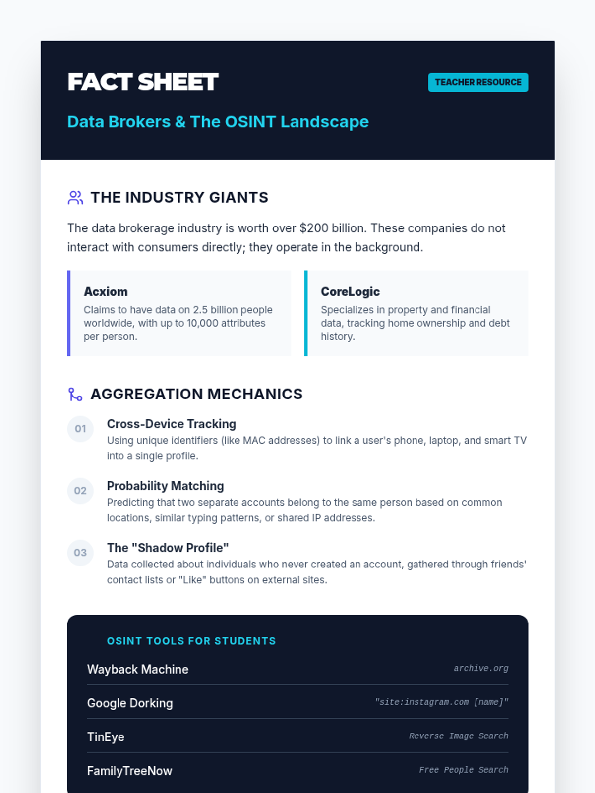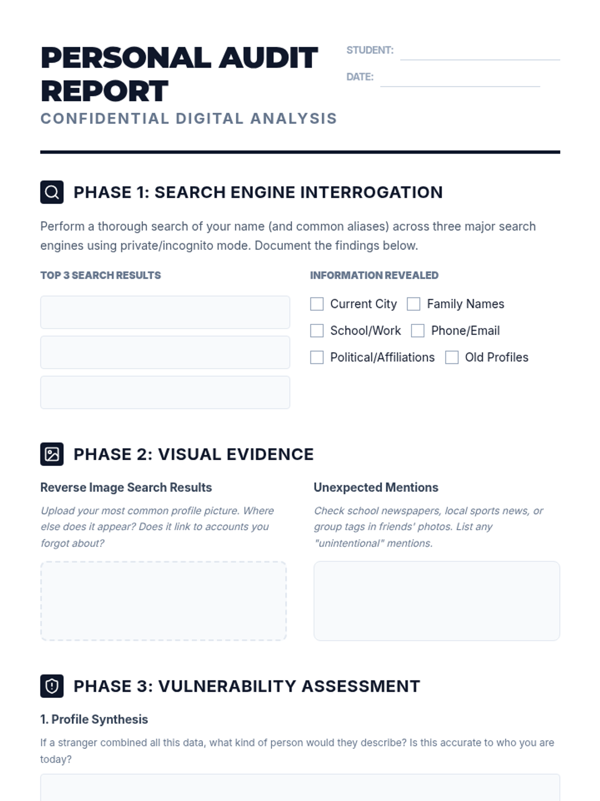 A comprehensive 11th-grade sequence on digital reputation, legal safety, and strategic online branding. Students transition from basic safety to professional asset management, exploring data aggregation, legal liabilities, social engineering, and algorithmic influence.