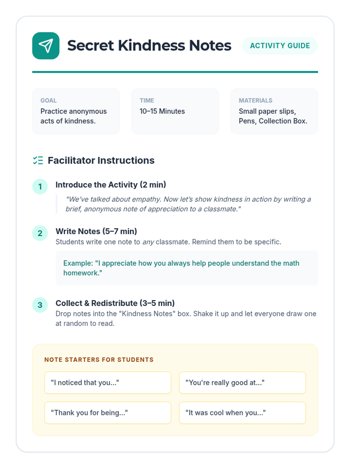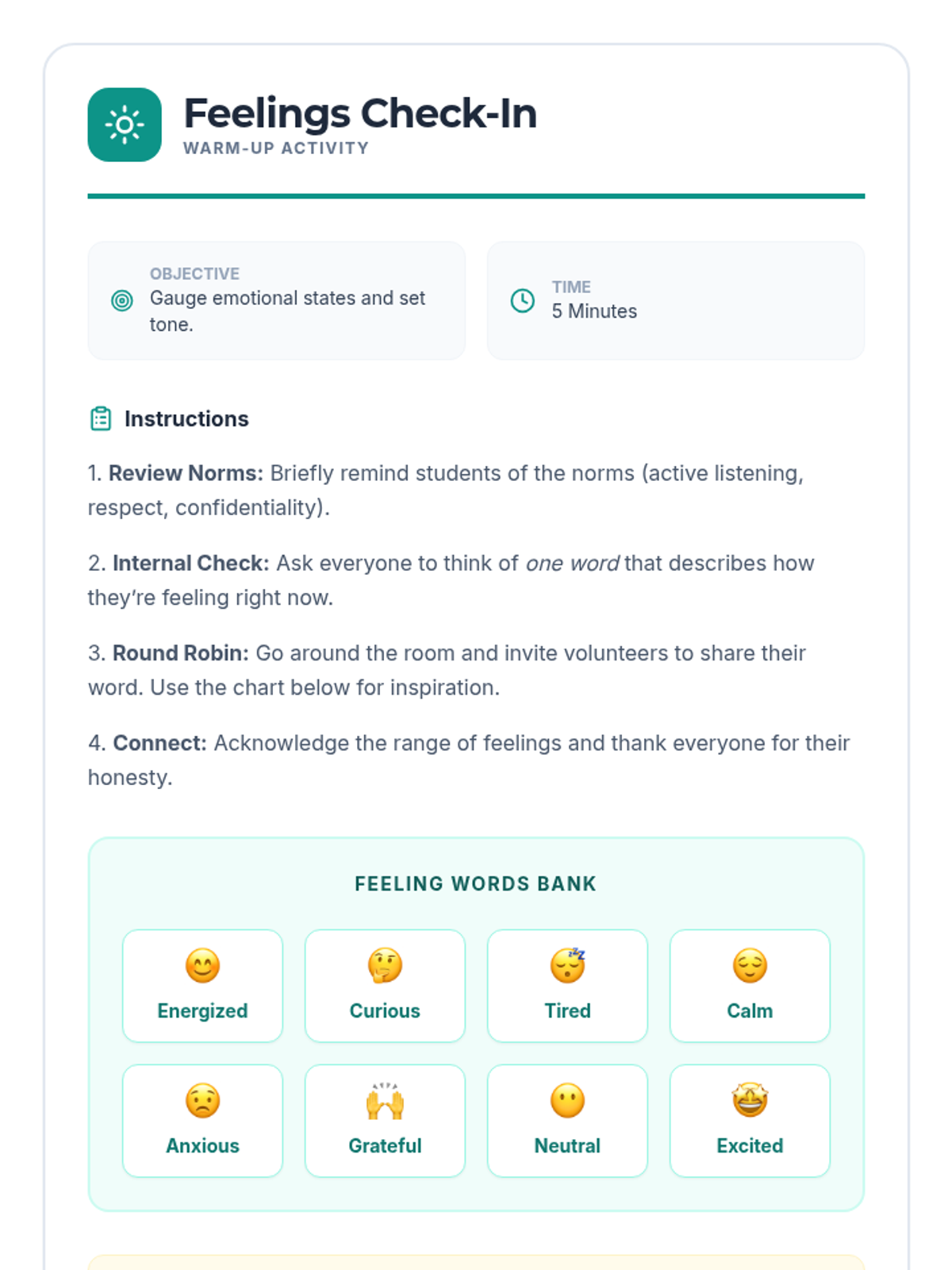 A comprehensive 5-lesson unit for 12th graders on building and facilitating peer support systems through structured check-in procedures. Students shift from participants to leaders, learning the psychological and practical skills needed to foster community trust and safety.