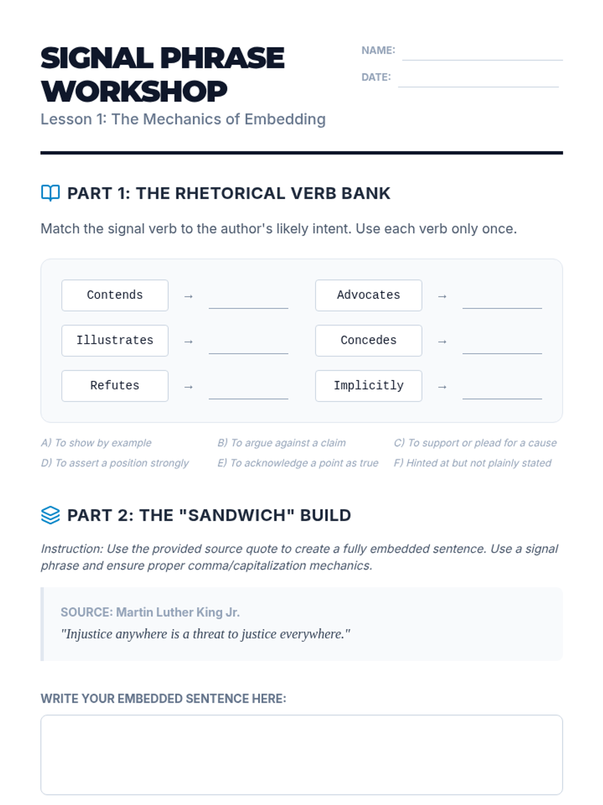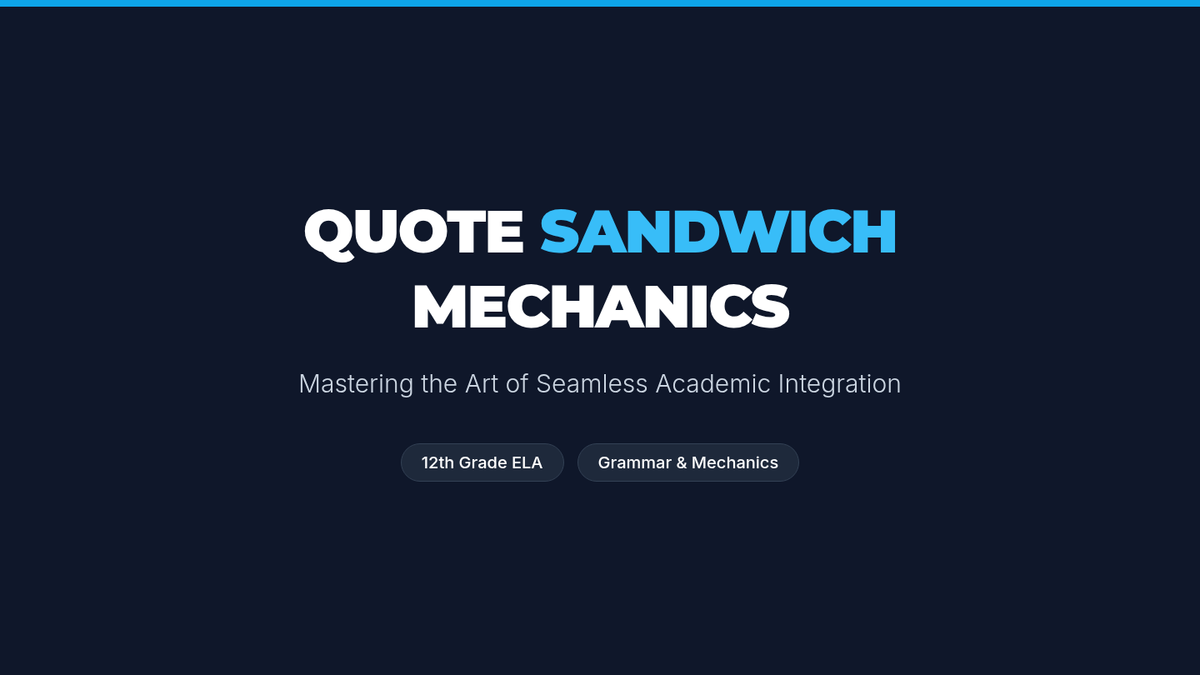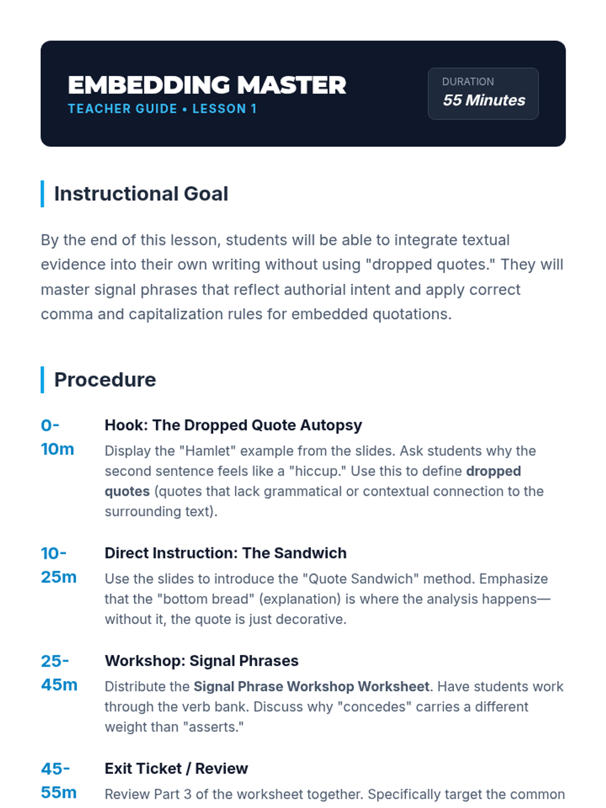 A comprehensive unit for 12th-grade students on the technical and ethical integration of quotations in academic writing, covering embedding, punctuation placement, modifications, block formatting, and genre differences.