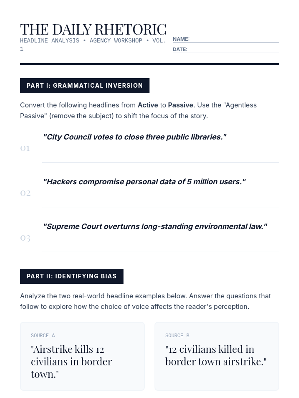 A college-preparatory sequence for 11th grade ELA focusing on the rhetorical and strategic implications of active and passive voice. Students move beyond basic identification to understand how voice choice shapes agency, objectivity, and political narrative.