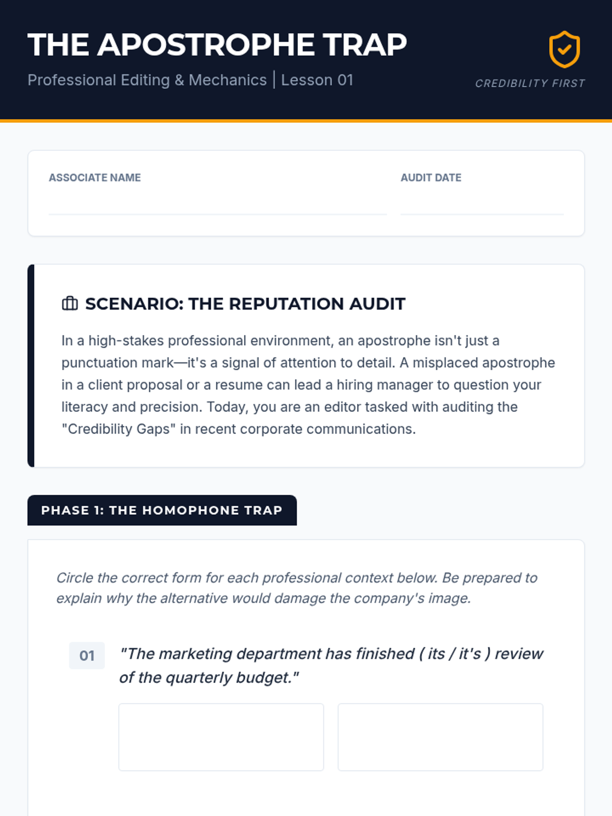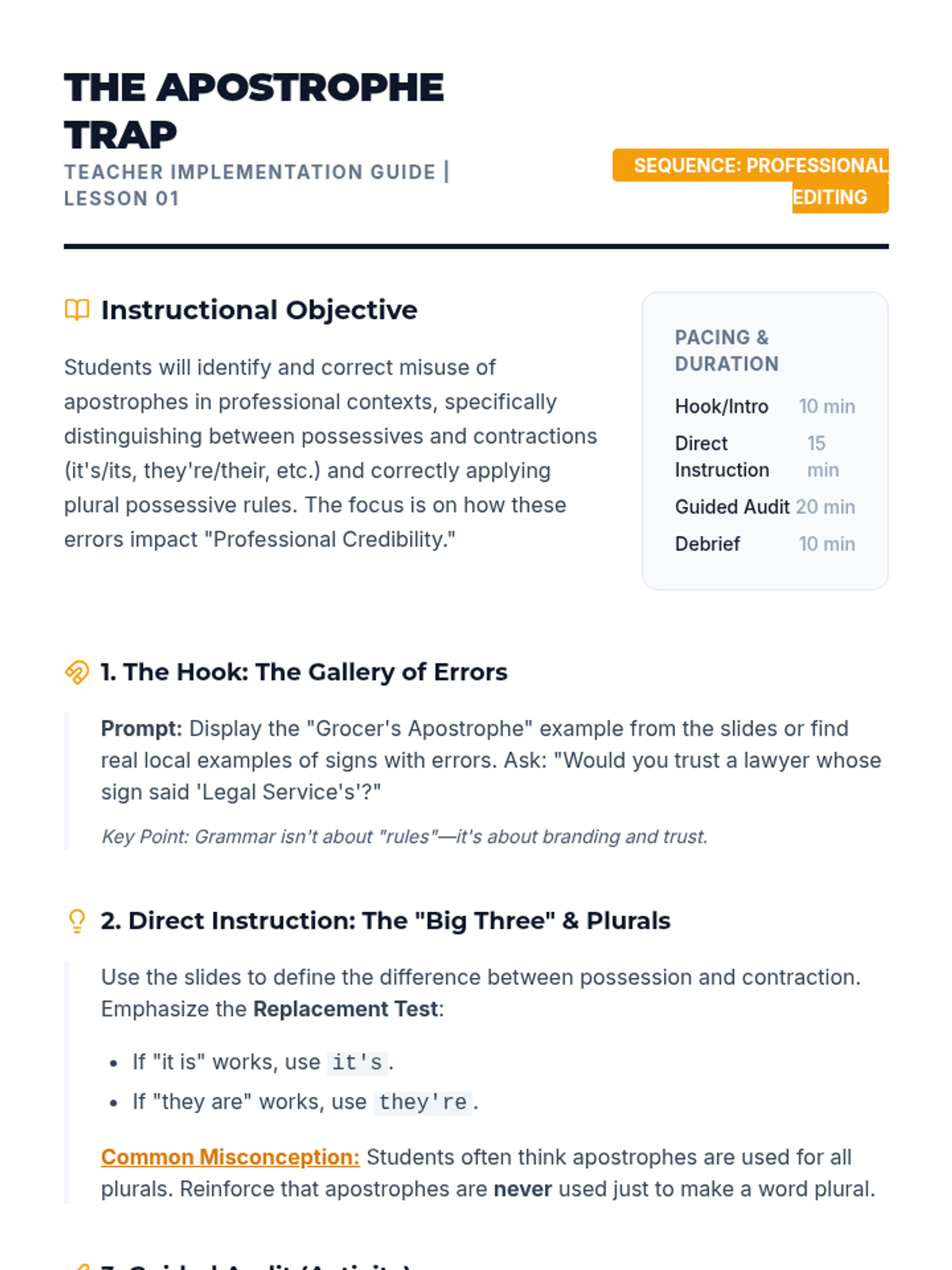 A workplace-simulated grammar sequence for 12th graders, focusing on how mechanical precision in punctuation and capitalization impacts professional credibility. Students act as editors and hiring managers to master apostrophes, capitalization, complex lists, and dashes.