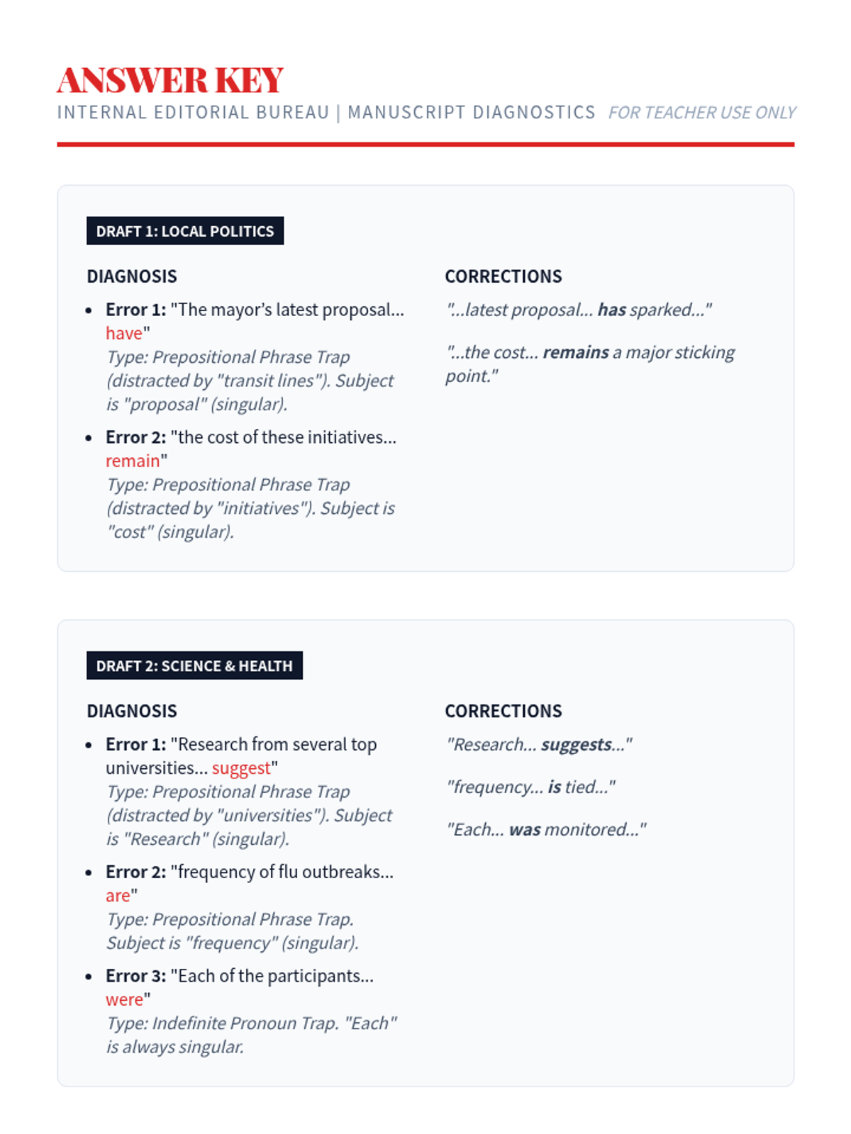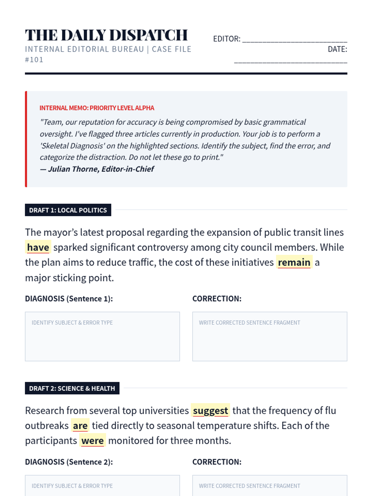 A high-stakes simulation where 12th-grade students act as professional copy editors to master subject-verb agreement in journalism, corporate communication, and technical writing. This sequence focuses on how grammatical precision establishes professional ethos and clarity.