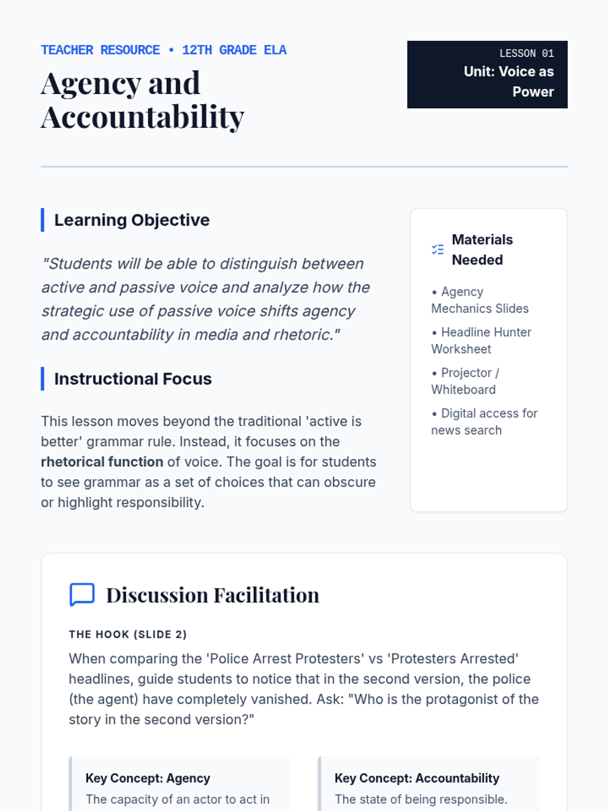 A 12th-grade ELA unit that moves beyond simple grammar to explore active and passive voice as tools for rhetorical strategy, agency, and bias. Students analyze political rhetoric, scientific writing, and media bias to master the art of voice.