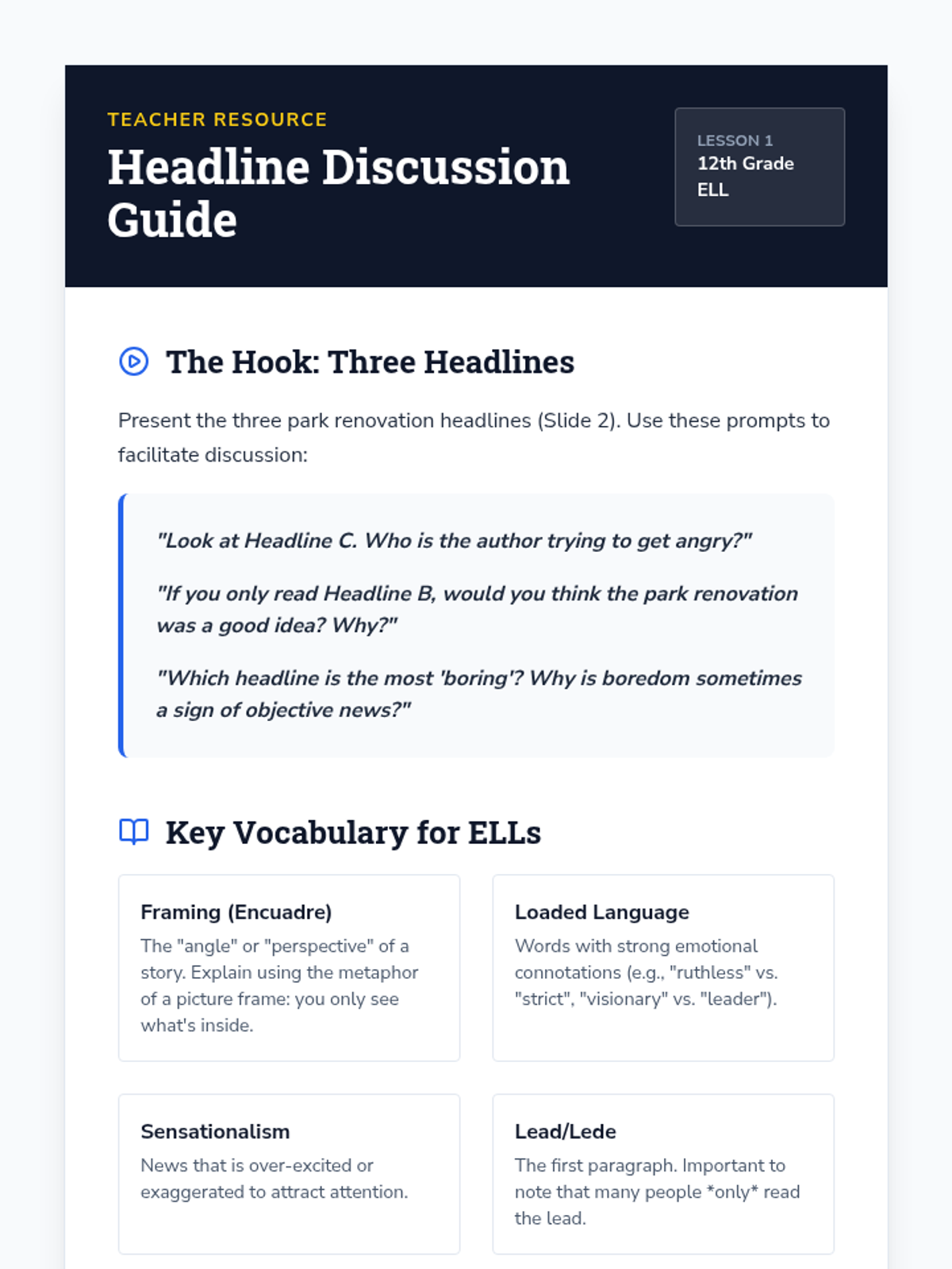A media literacy sequence for 12th-grade ELL students focused on identifying bias, loaded language, and framing in news texts. Students progress from analyzing headlines to conducting a full comparative analysis of media coverage on current events.