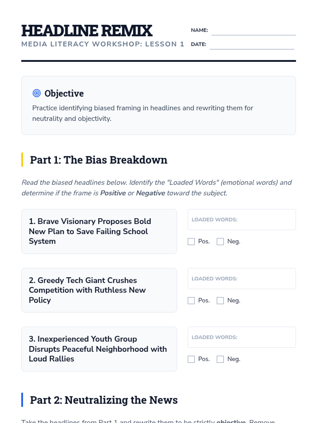 A comprehensive unit for intermediate English learners focusing on critical reading of news, identifying bias, and analyzing rhetorical strategies in media. Students transition from identifying basic facts to conducting comparative analyses of international journalism.