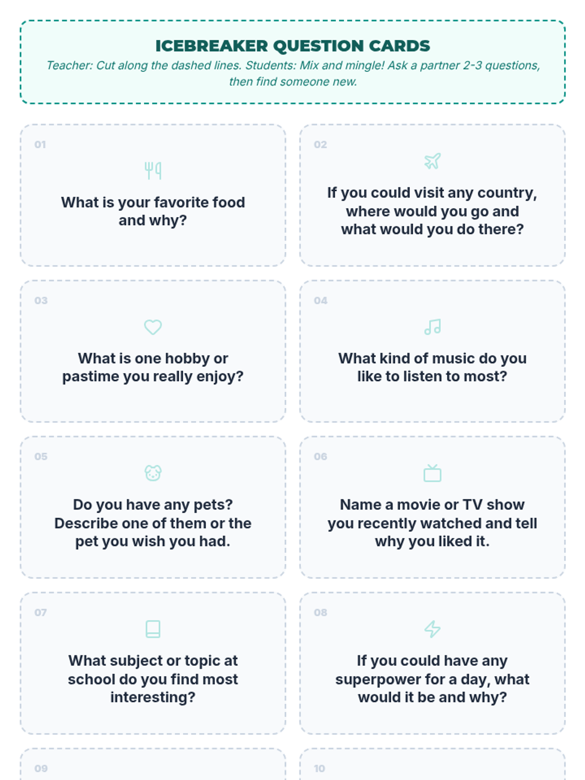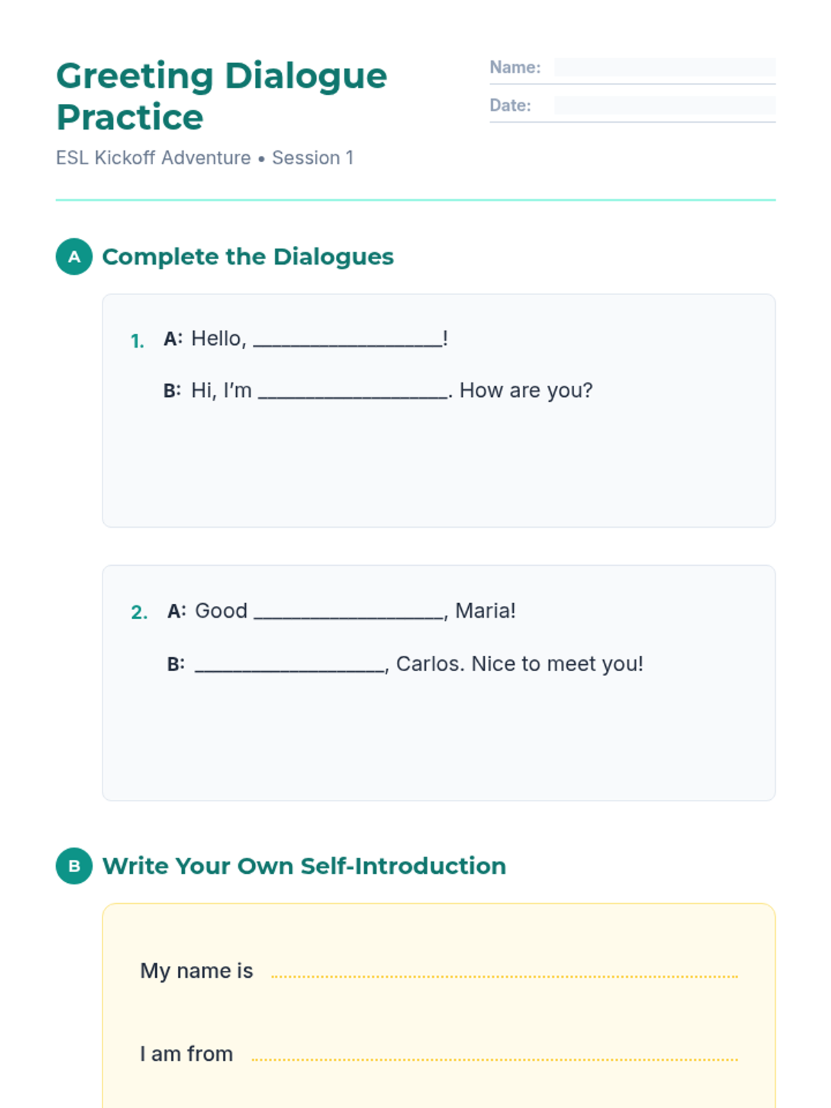 A three-session introductory ESL sequence designed for Spanish-speaking teenagers to build confidence and community through interactive ice-breakers and guided conversations.
