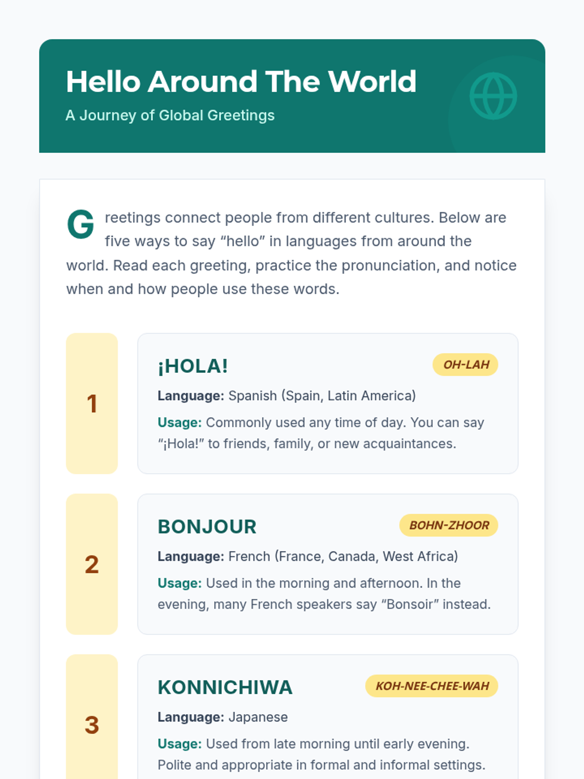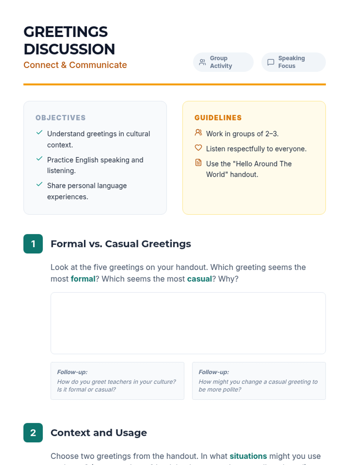 A comprehensive unit for high school English language learners to master the social nuances of greetings, self-introductions, and cultural etiquette in varied contexts.