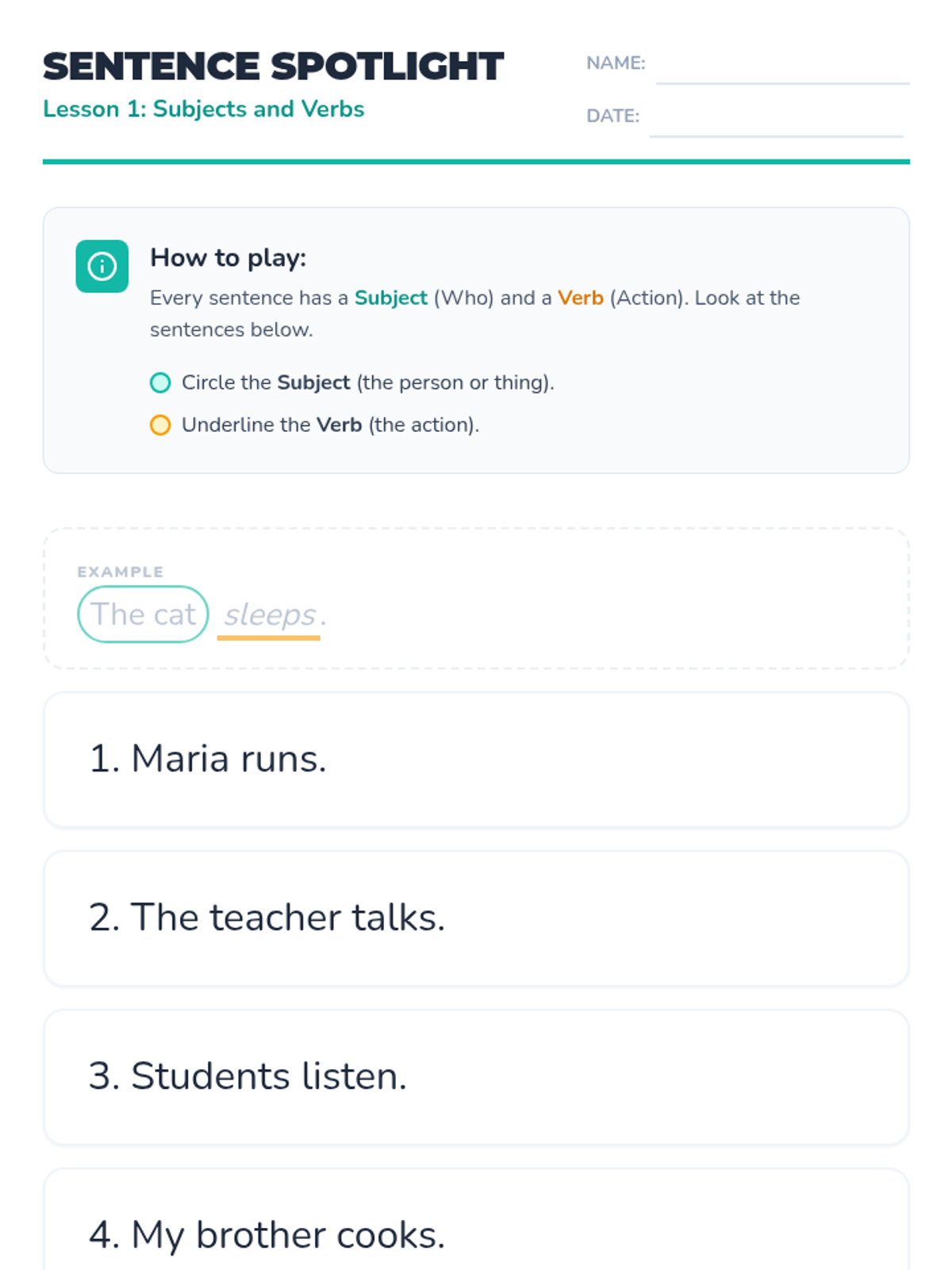 This beginner-level sequence introduces 12th-grade ELL students to basic English sentence structure (Subject-Verb-Object) and simple descriptive reading. Students progress from identifying sentence parts to understanding tenses and conjunctions, culminating in a personal narrative project.