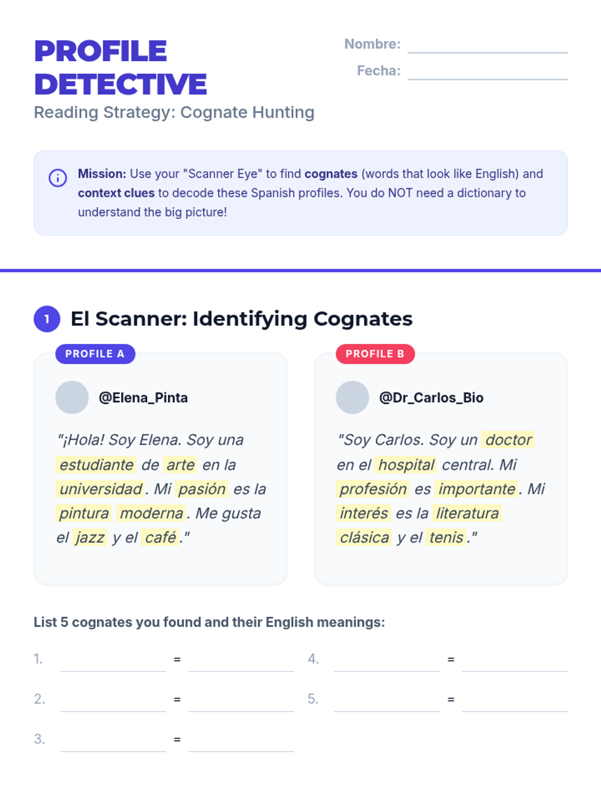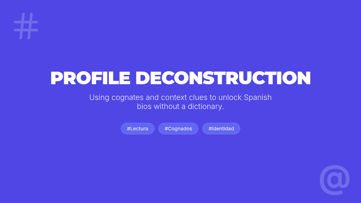 A beginner Spanish reading sequence for 12th graders focused on deconstructing personal narratives and social media profiles. Students develop reading strategies like identifying cognates and context clues to understand identity, personality, and family dynamics in Spanish-speaking cultures.