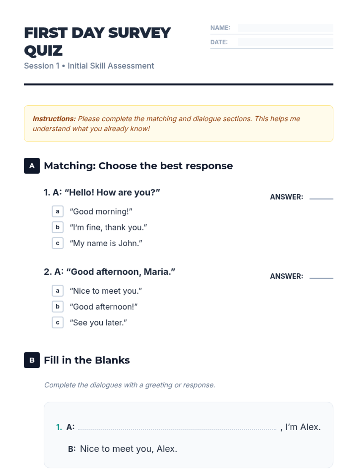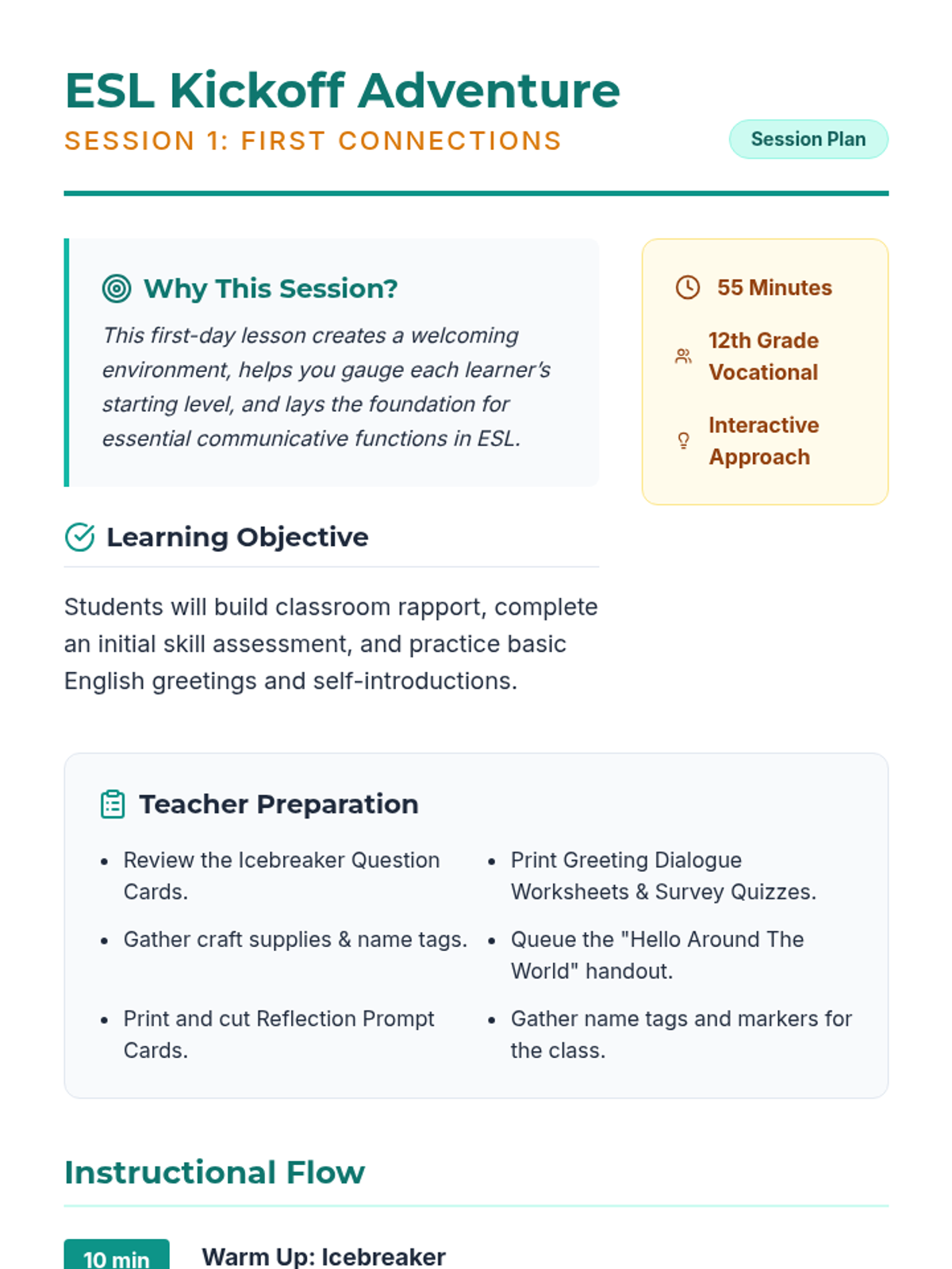 A comprehensive 5-session introductory unit for 12th-grade vocational ESL students focused on building rapport, assessing skills, and establishing essential communicative foundations.