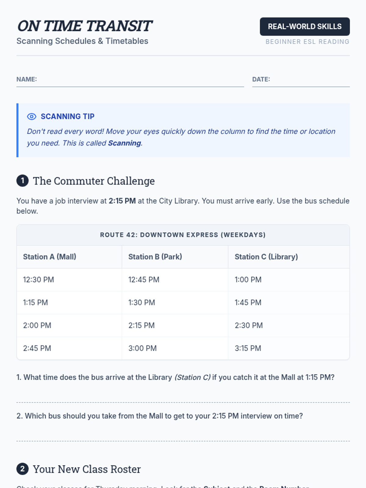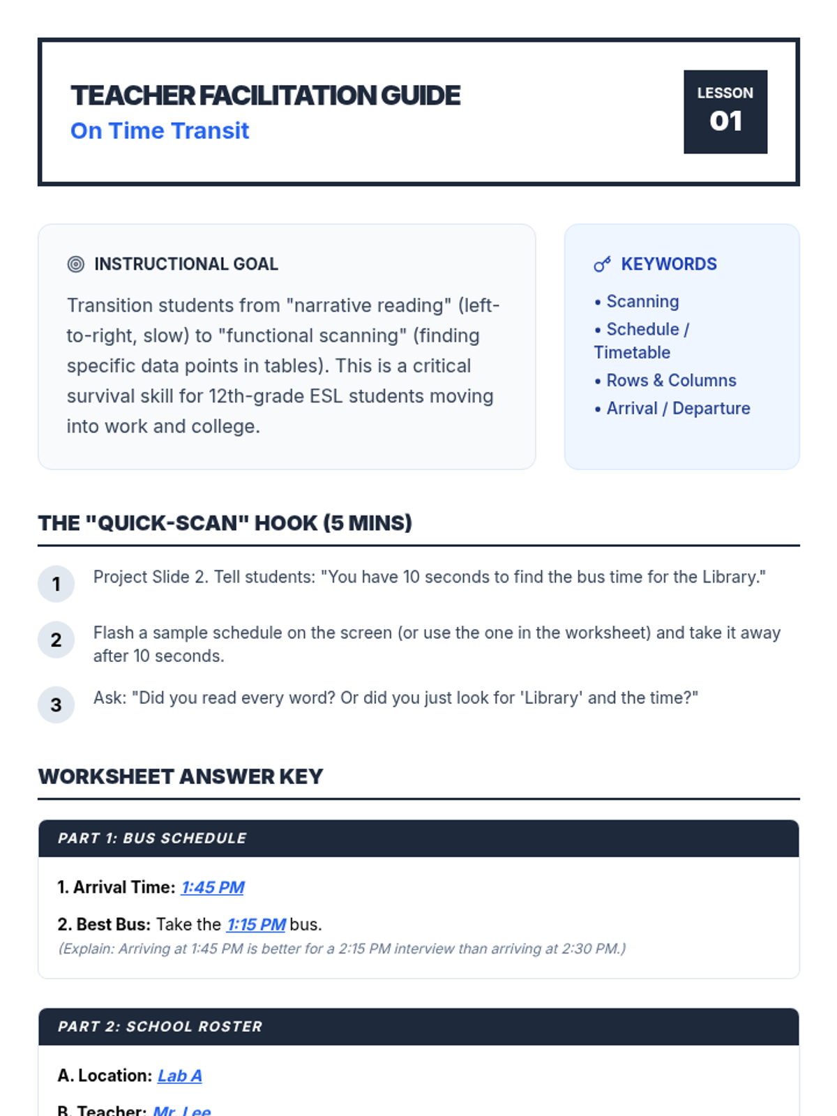 This sequence equips 12th-grade ESL students with the practical reading skills needed to navigate functional documents like schedules, receipts, menus, and pay stubs. Through real-world simulations, students move from scanning simple lists to interpreting complex financial data, preparing them for the transition to adult life.