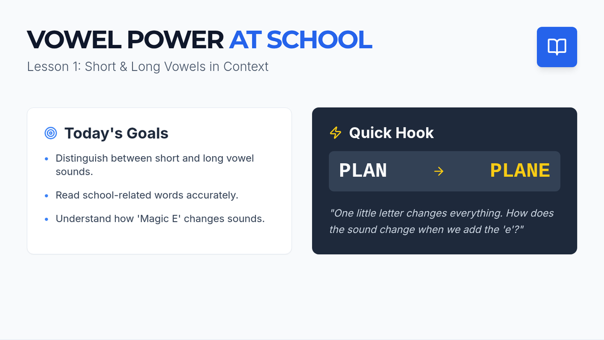 A foundational phonics and decoding sequence designed for 8th-grade English Language Learners. Students master vowel sounds, blends, digraphs, and syllabication through a workshop model using age-appropriate, school-centered vocabulary.