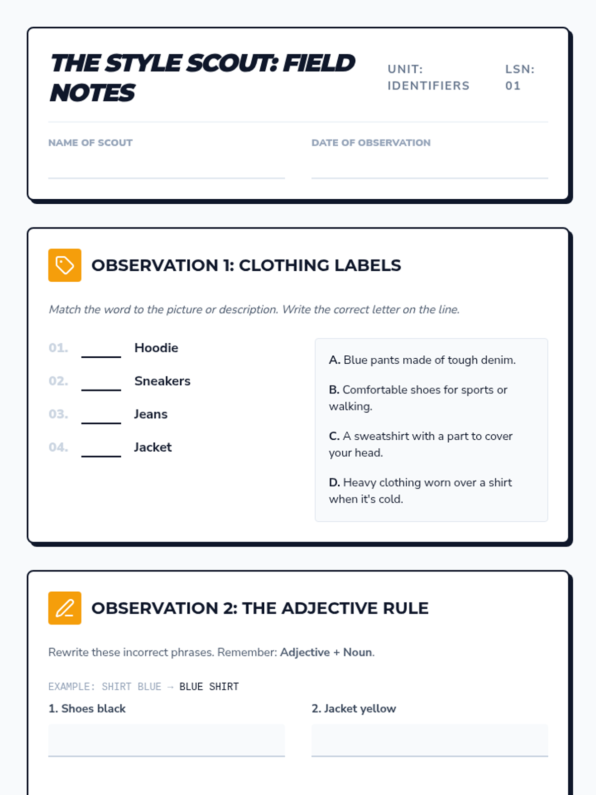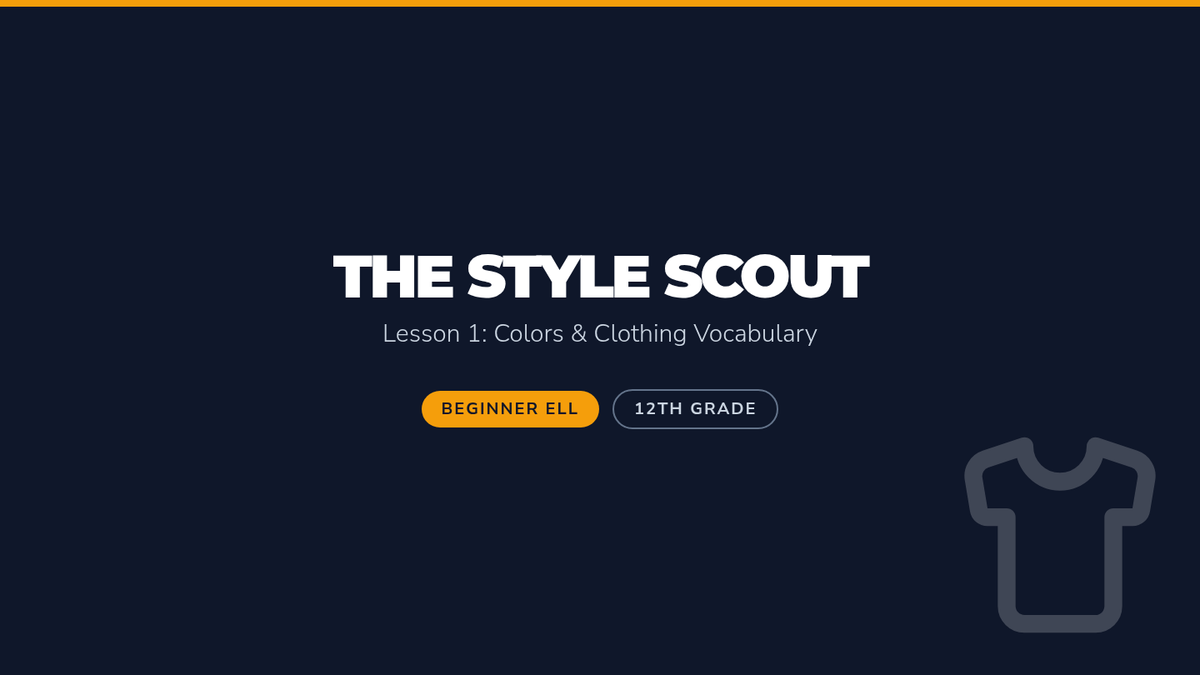 A comprehensive sequence for beginner ELL students focusing on descriptive vocabulary related to fashion, patterns, and physical characteristics. Students progress from basic colors to complex physical descriptions, culminating in a creative character-writing project.