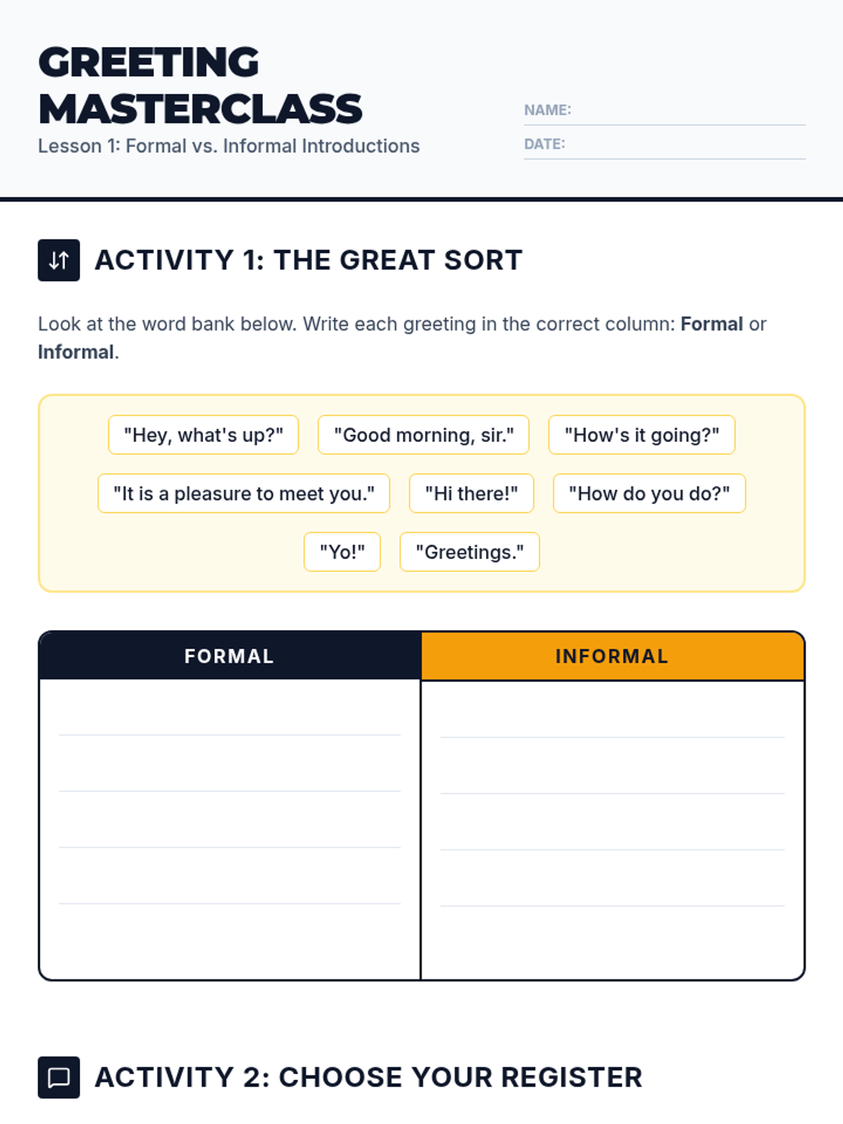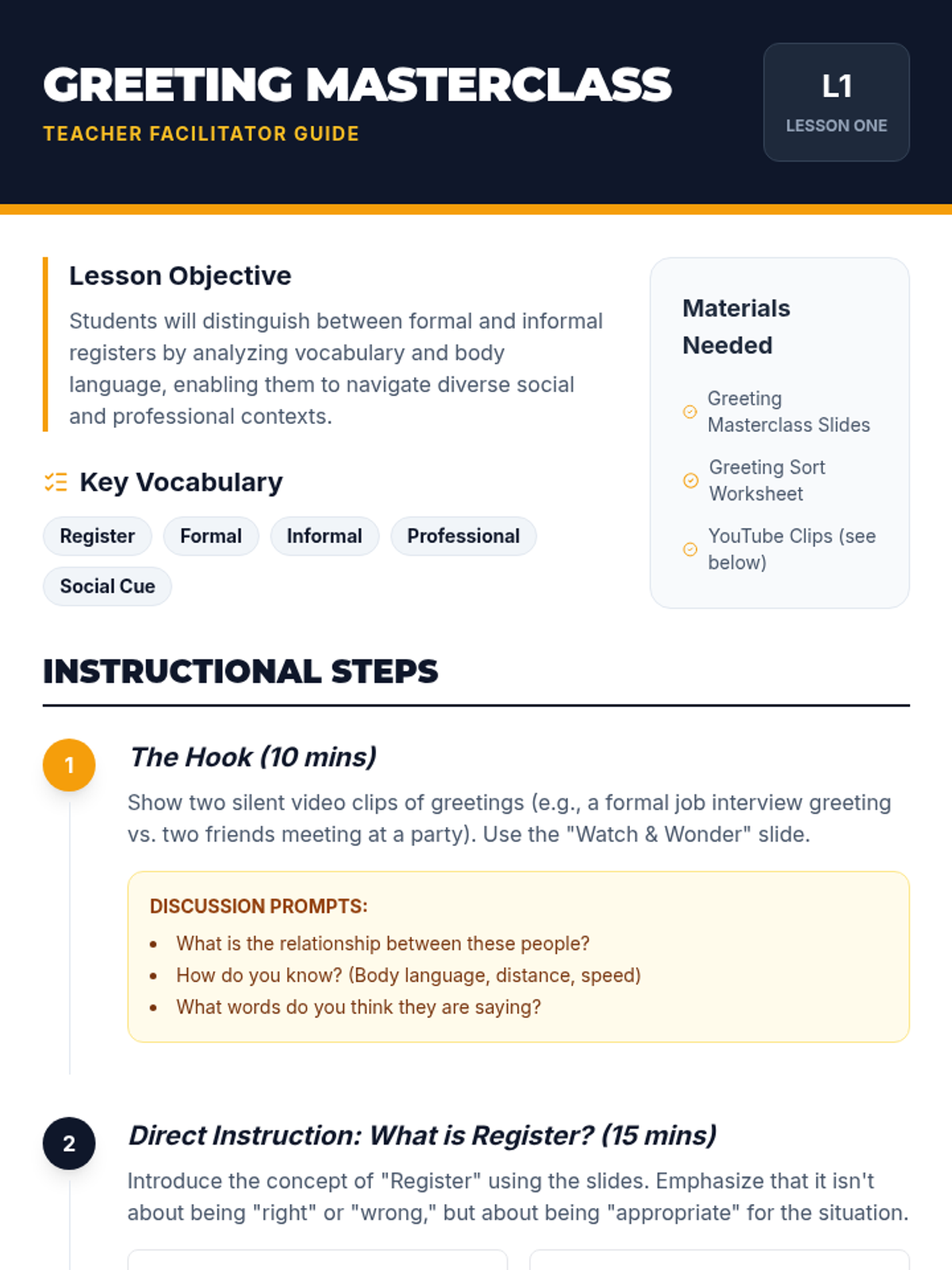 A comprehensive unit for 12th-grade beginner English learners focused on mastering the nuances of formal and informal introductions in professional and social settings.