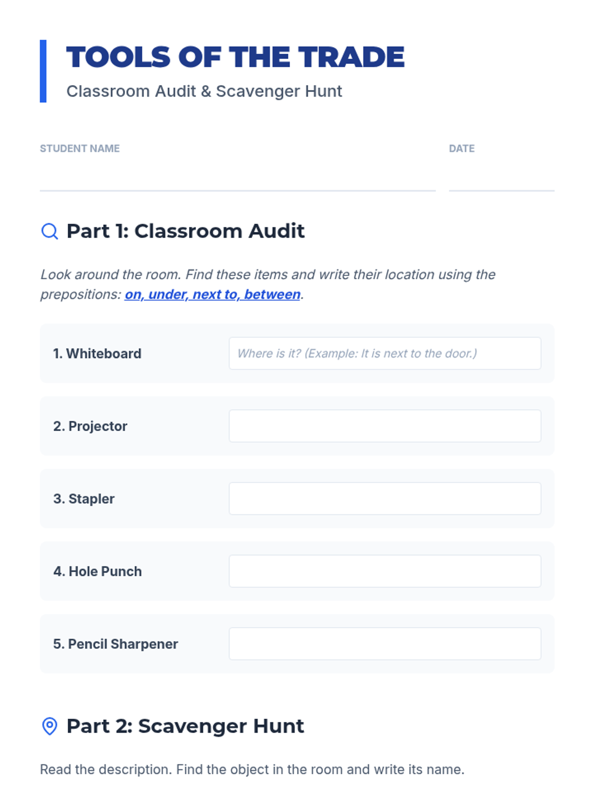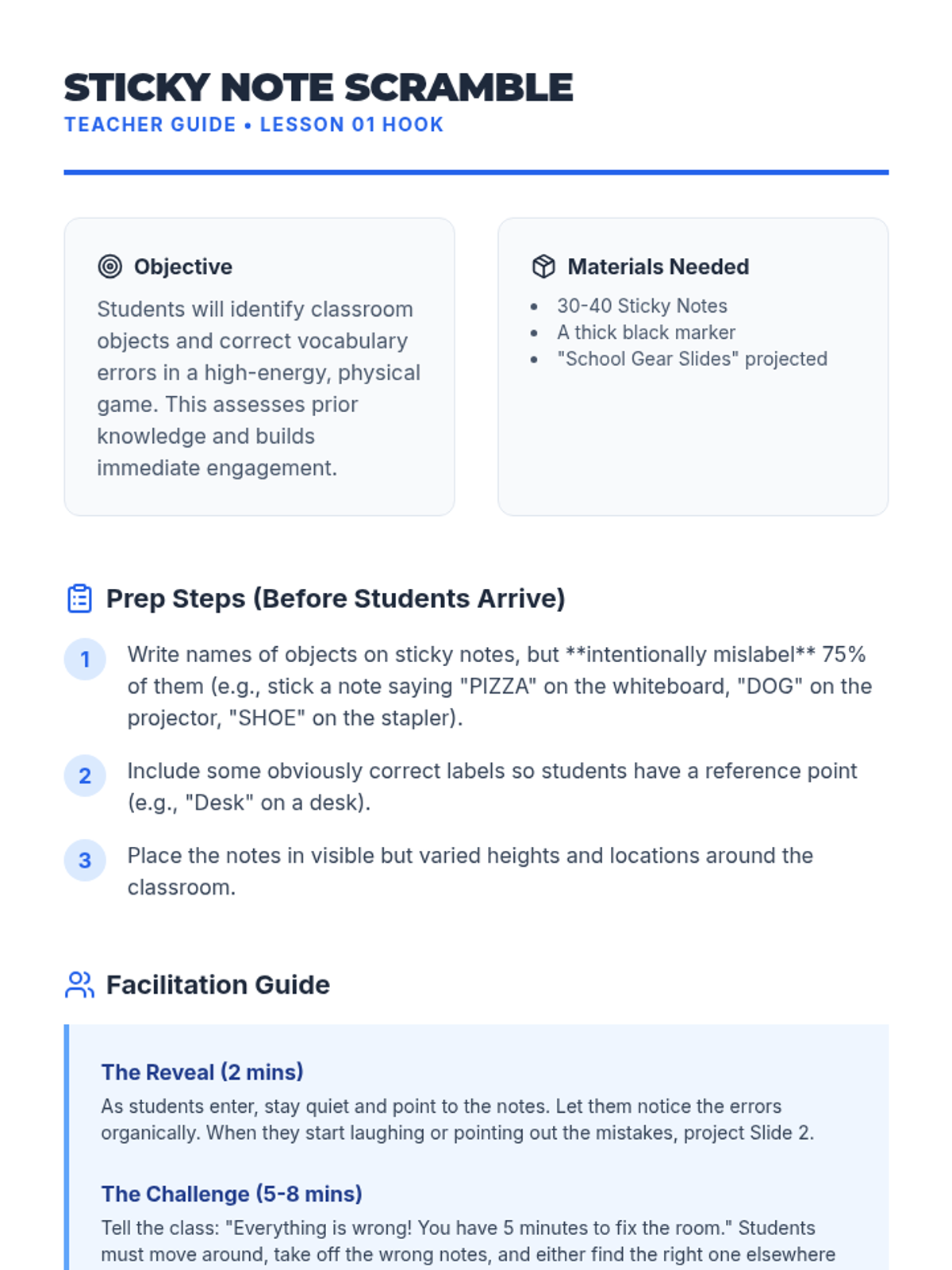 A 5-lesson unit for beginner English Language Learners (ELLs) focusing on classroom objects, instructional commands, colors, numbers, and prepositions. The sequence uses Total Physical Response (TPR) and gamified activities to build foundational vocabulary.