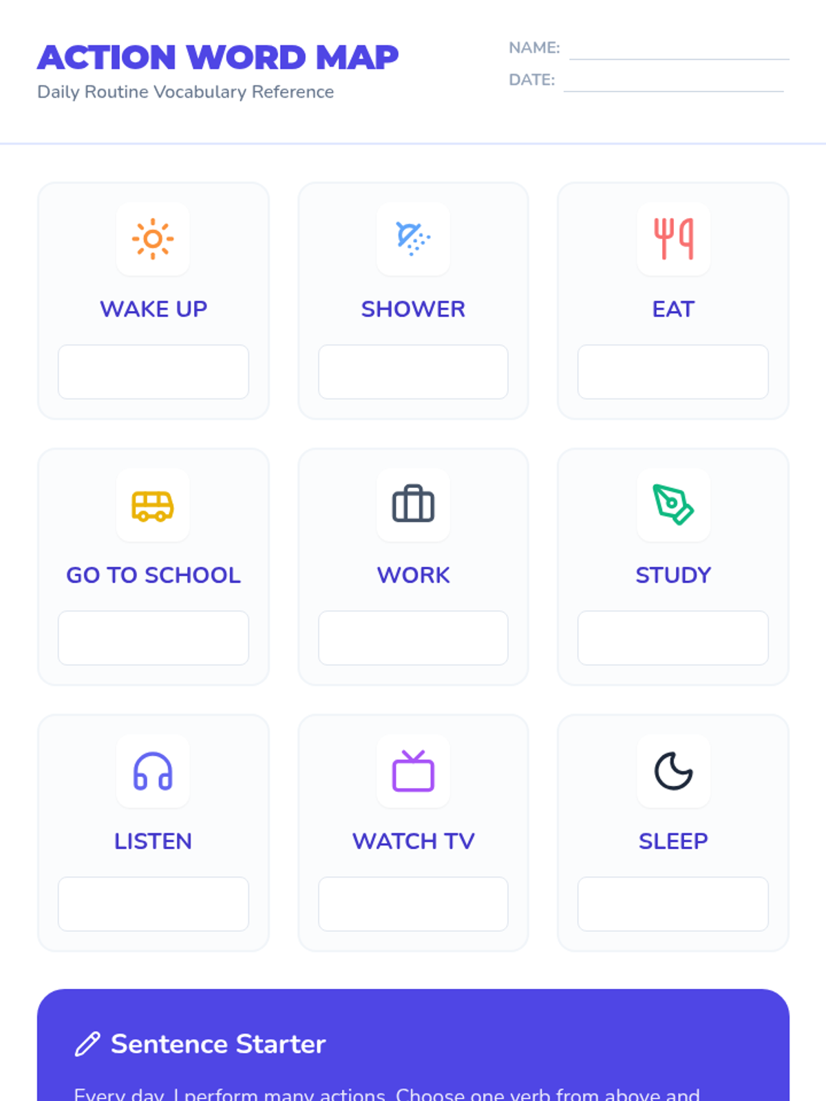 A foundational sequence for 6th-grade ESL beginners focused on high-frequency action verbs, time-telling, and sequencing routines. Students build the vocabulary and structures needed to describe their daily lives and personal preferences.