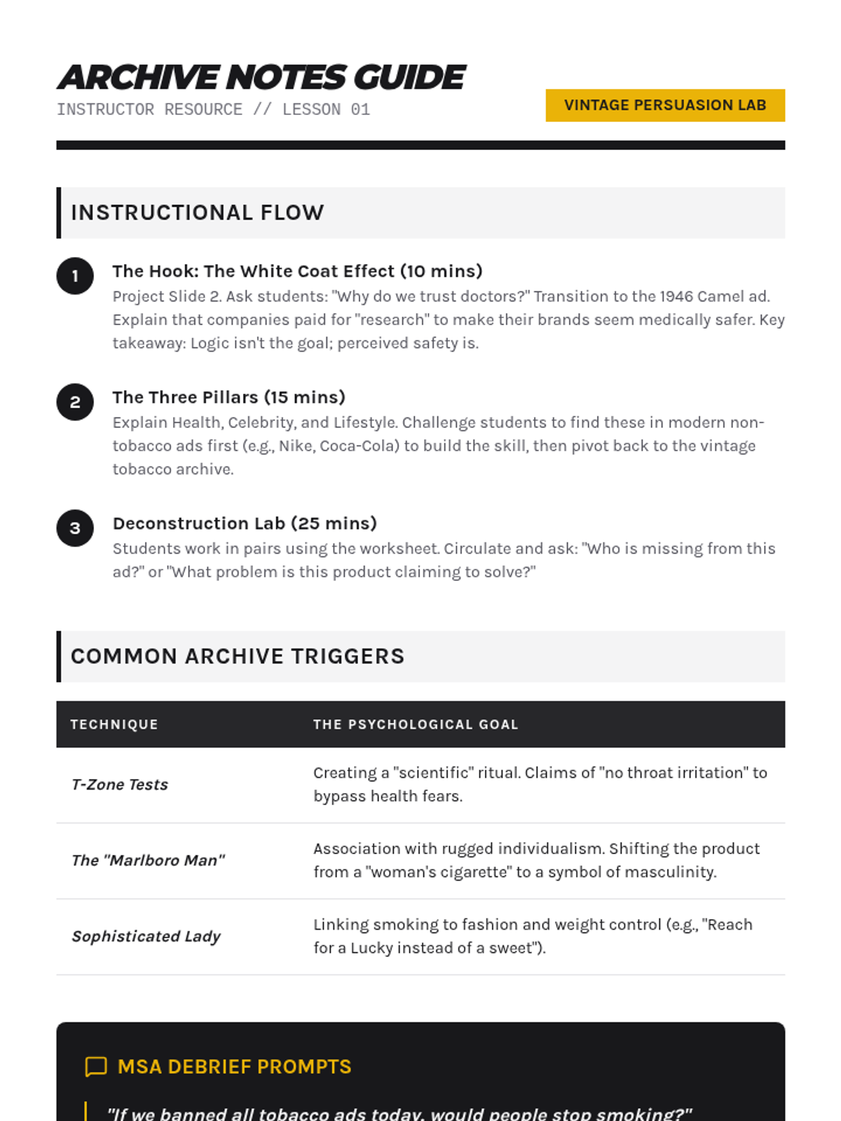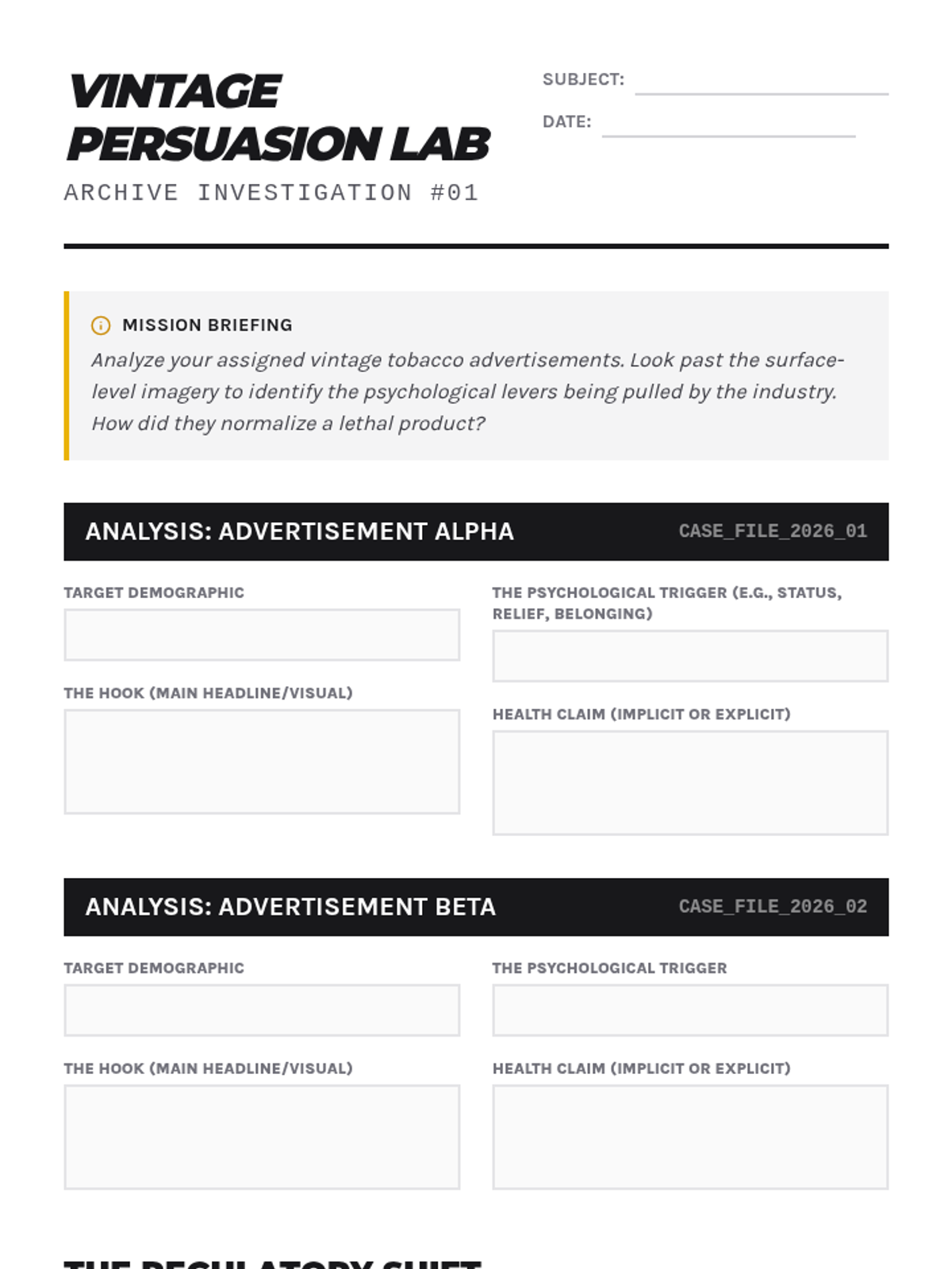A comprehensive 12th-grade unit analyzing the evolution of tobacco and nicotine marketing, from mid-century print ads to modern social media algorithms, culminating in a counter-marketing project.