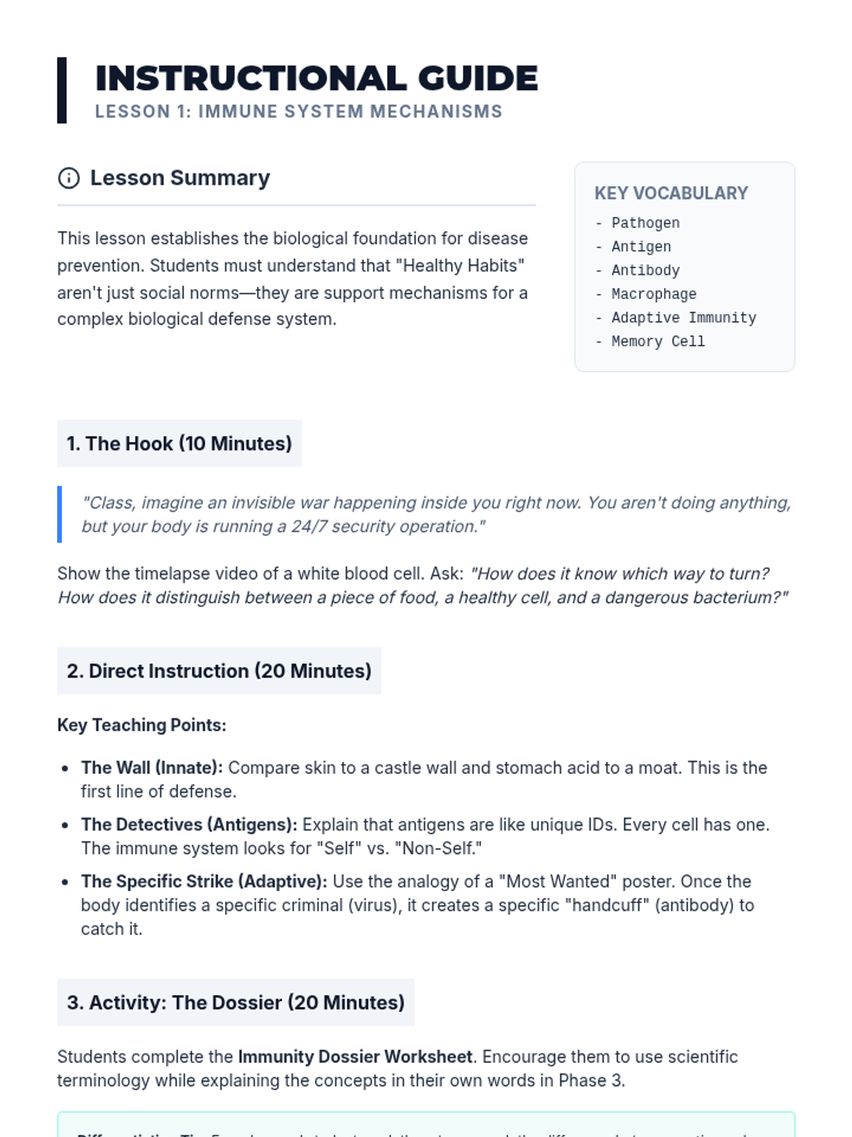 This high school health sequence explores the cumulative impact of daily habits—sleep, stress management, nutrition, and hygiene—on chronic disease prevention. Students analyze the biological mechanisms of immunity and lifestyle-related illness to design a personalized prevention blueprint for long-term health.