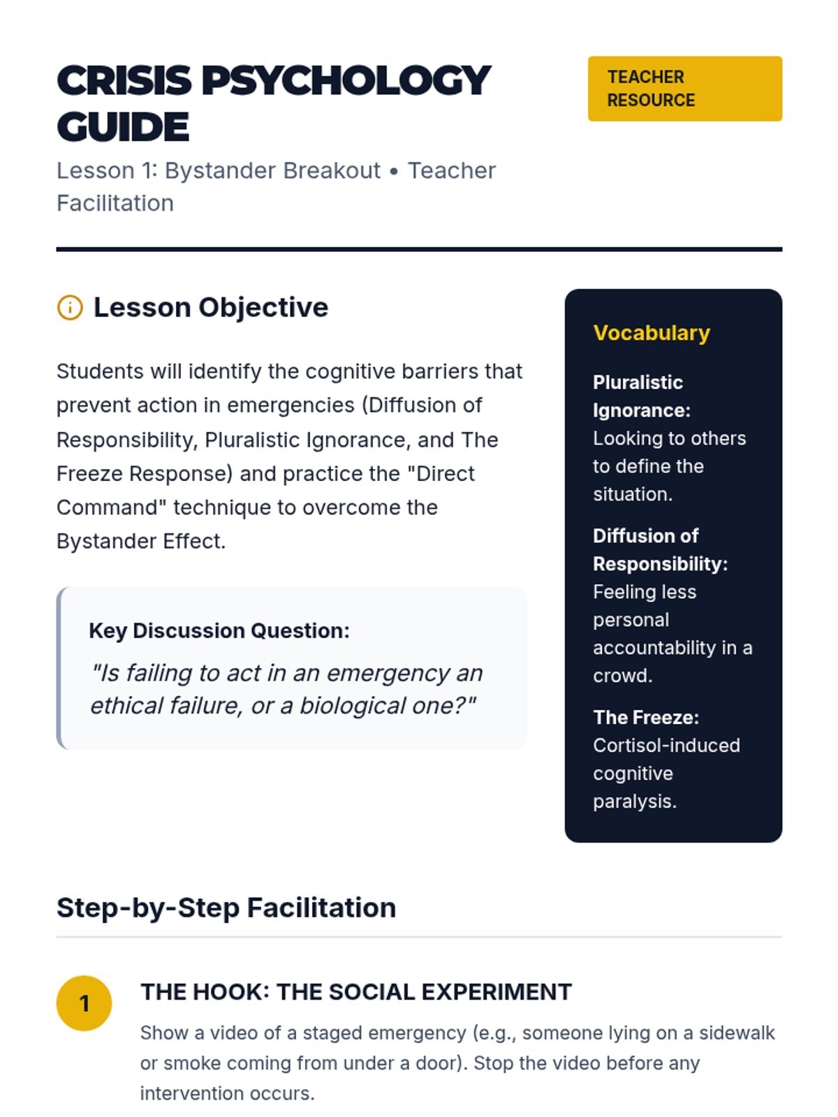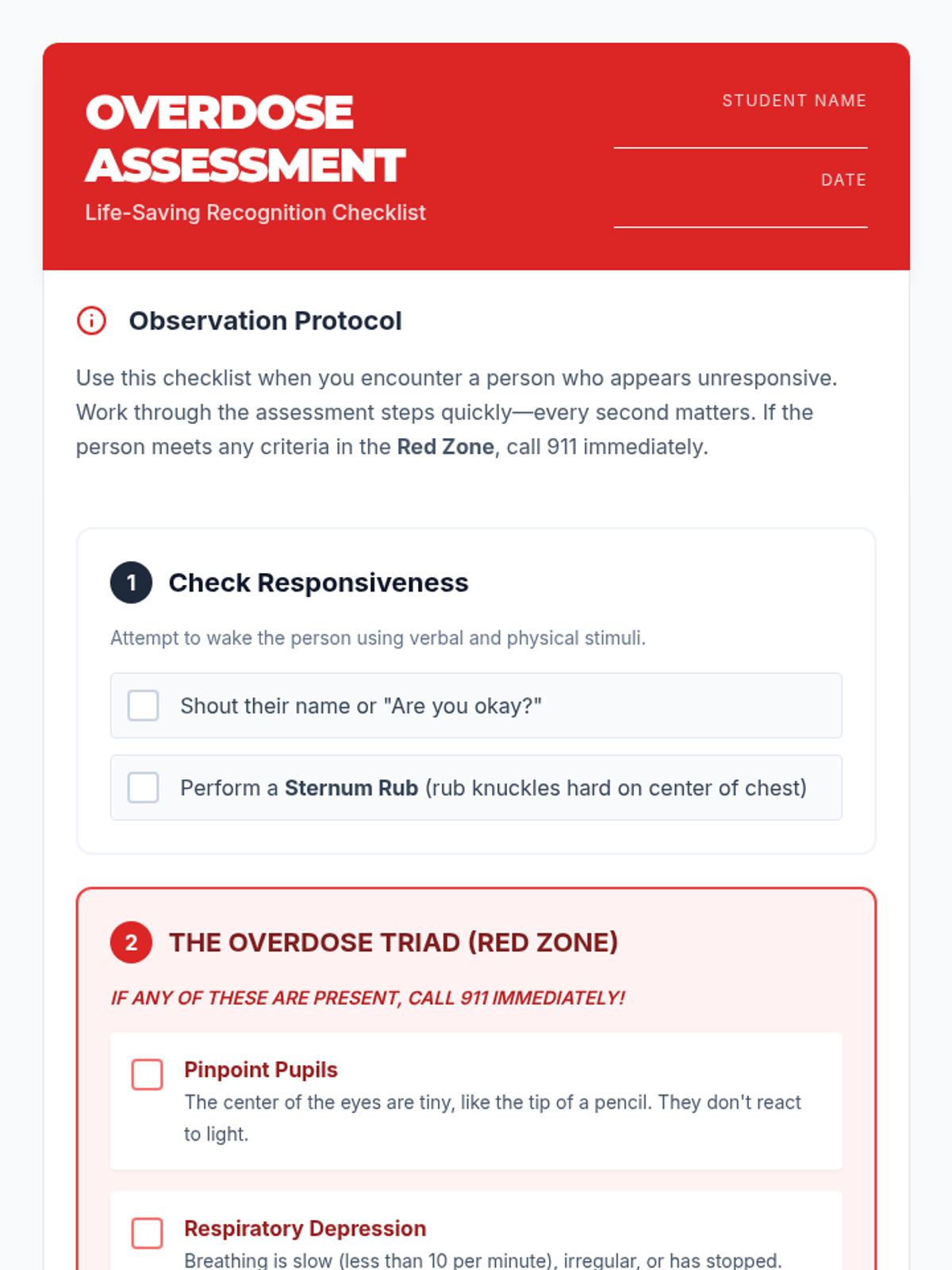 A comprehensive 11th-grade sequence focused on recognizing opioid overdoses, understanding legal protections, and mastering Naloxone administration to save lives.
