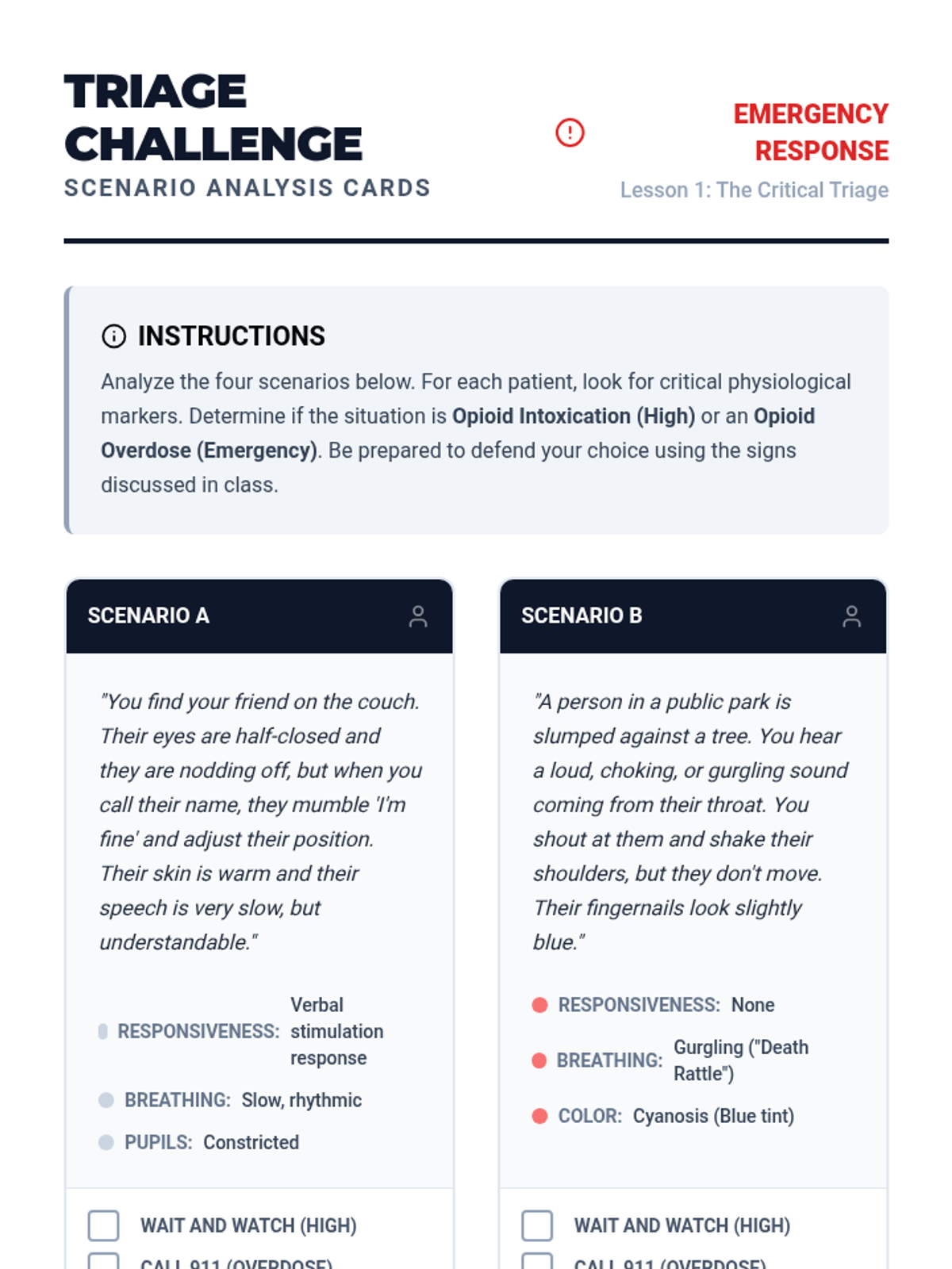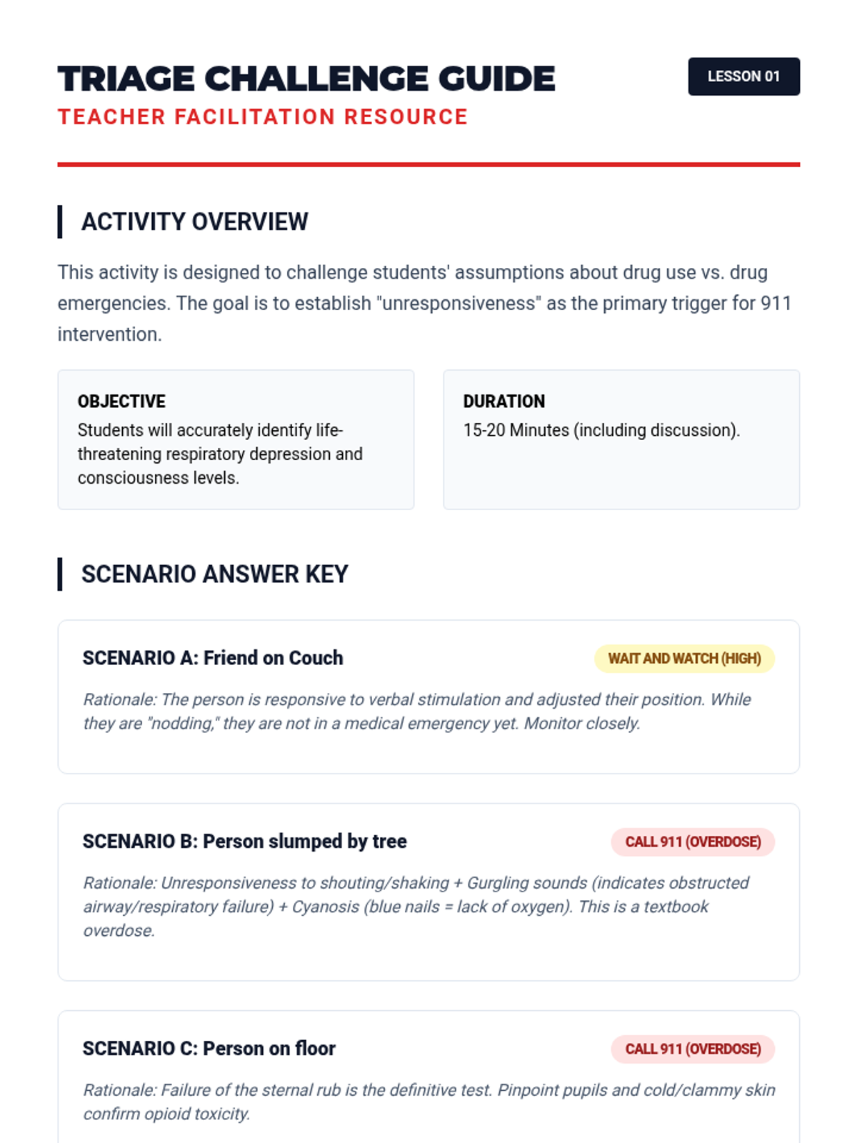 This sequence equips 9th-grade students with the life-saving skills to identify and respond to an opioid overdose. It covers the 'opioid triad' of symptoms, legal protections under Good Samaritan laws, effective 911 communication, and the step-by-step administration of naloxone.