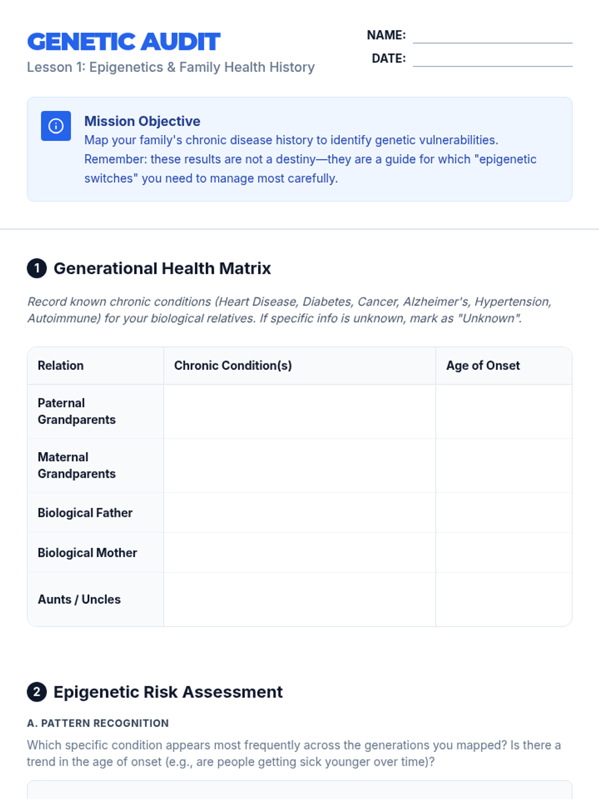 A comprehensive 12th-grade health sequence exploring the intersection of genetics, lifestyle, and social factors in chronic disease prevention. Students transition to independent living by designing personal prevention plans based on epigenetics and metabolic health.