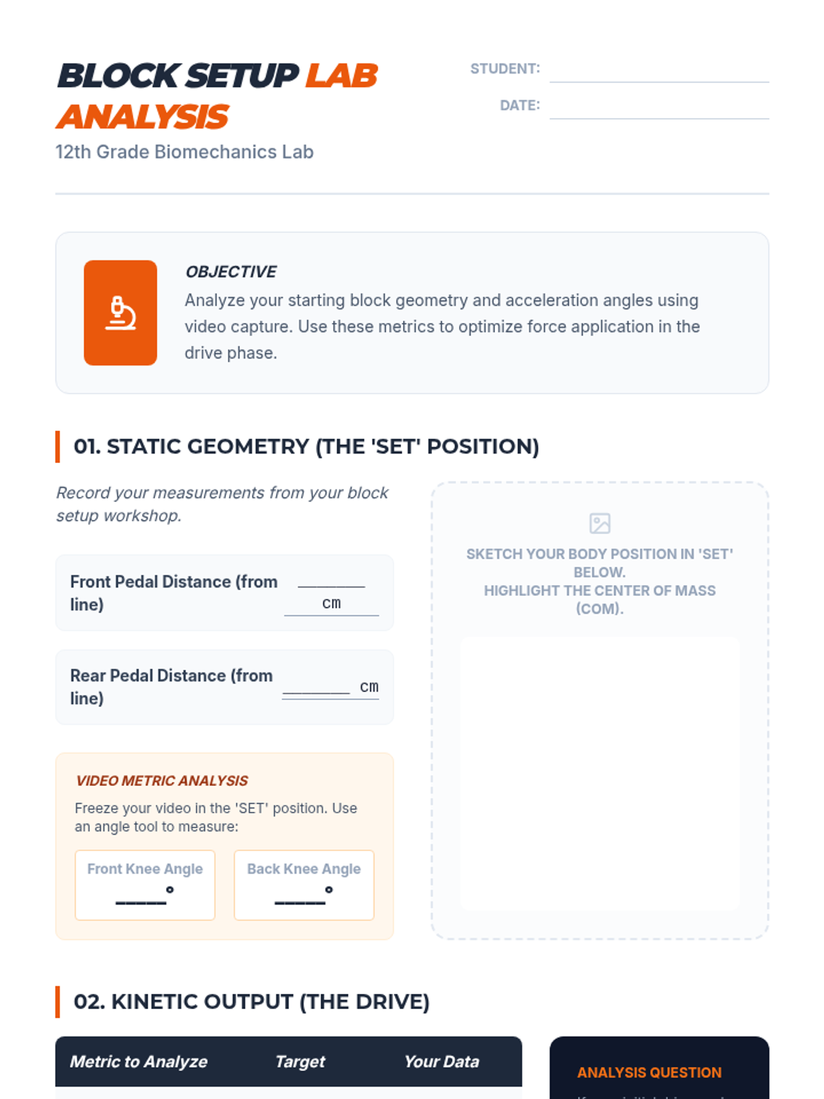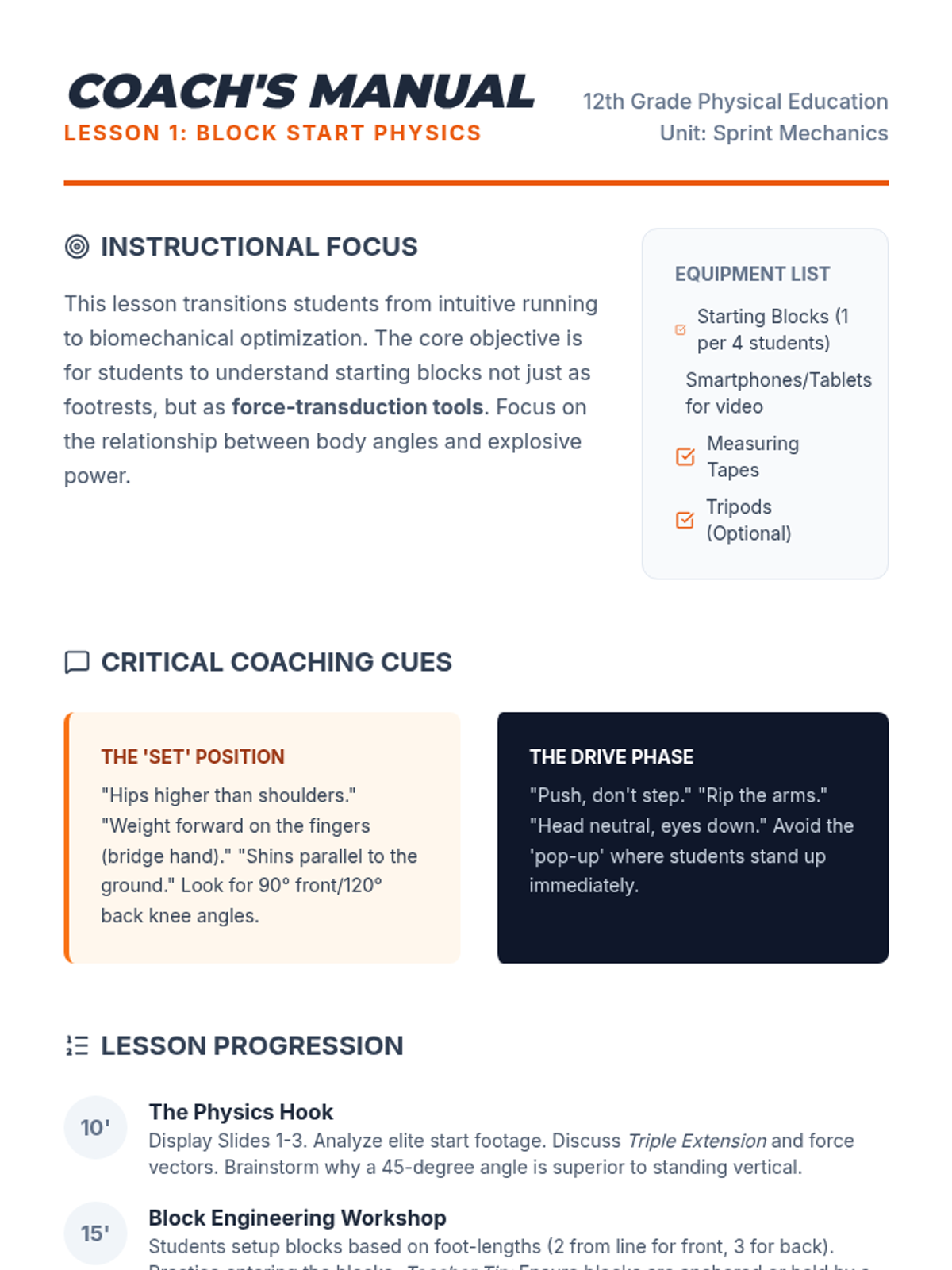 A high-performance track and field unit for 12th-grade students that integrates biomechanics and physiology. Students analyze acceleration physics, stride efficiency, energy systems, and relay coordination to optimize their athletic performance through data-driven training.