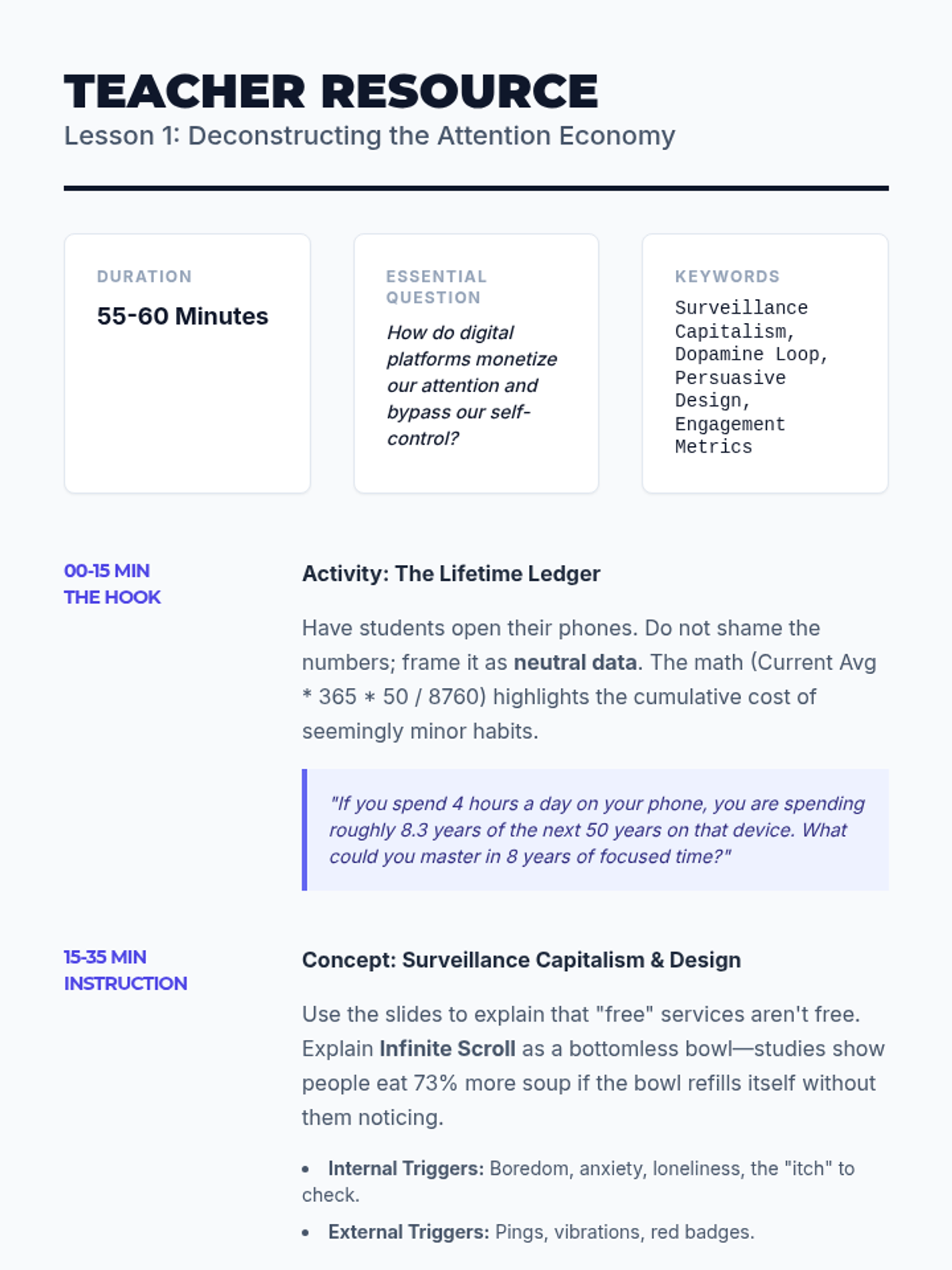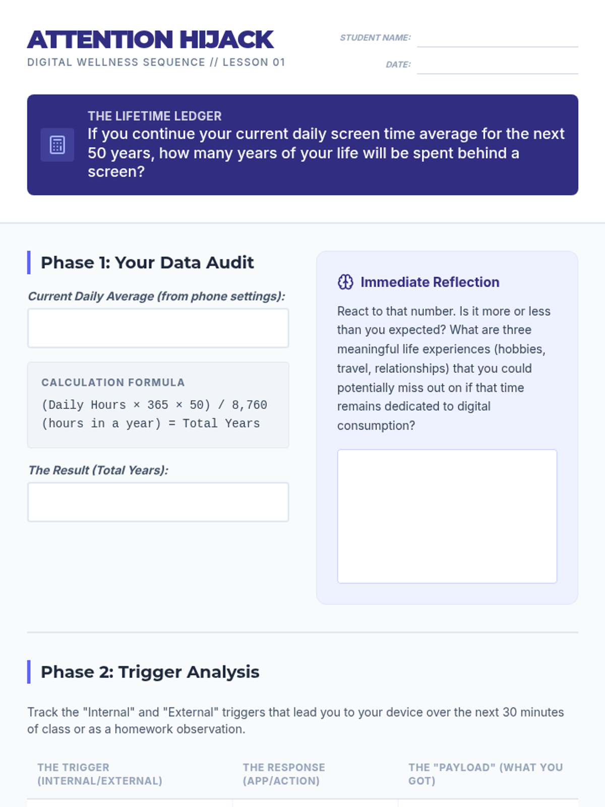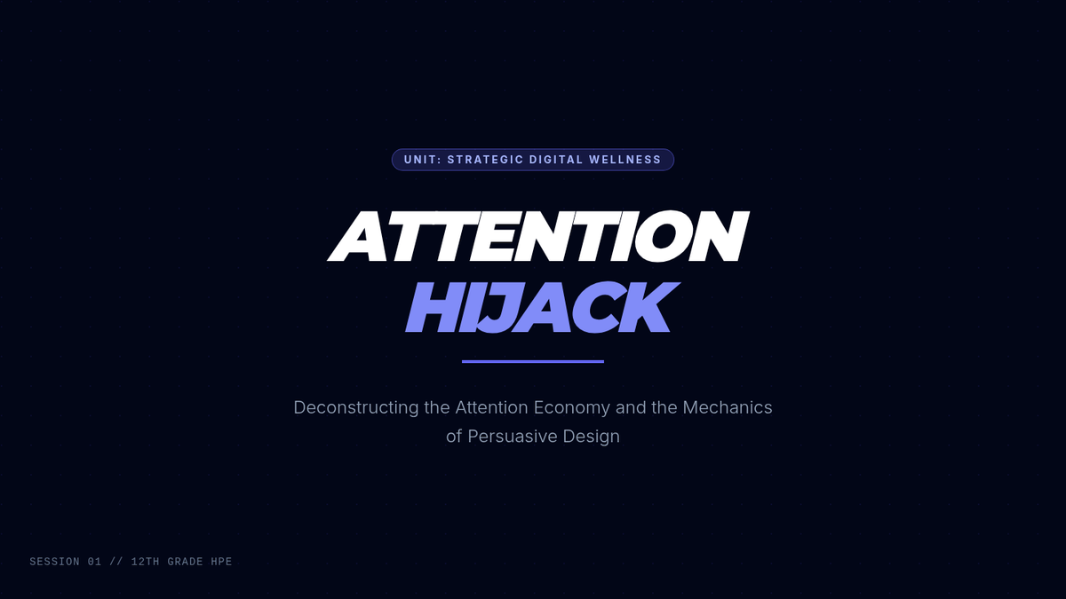 An advanced digital literacy and mental health sequence for 12th graders, focusing on tech ethics, algorithmic influence, and personal agency in the attention economy.