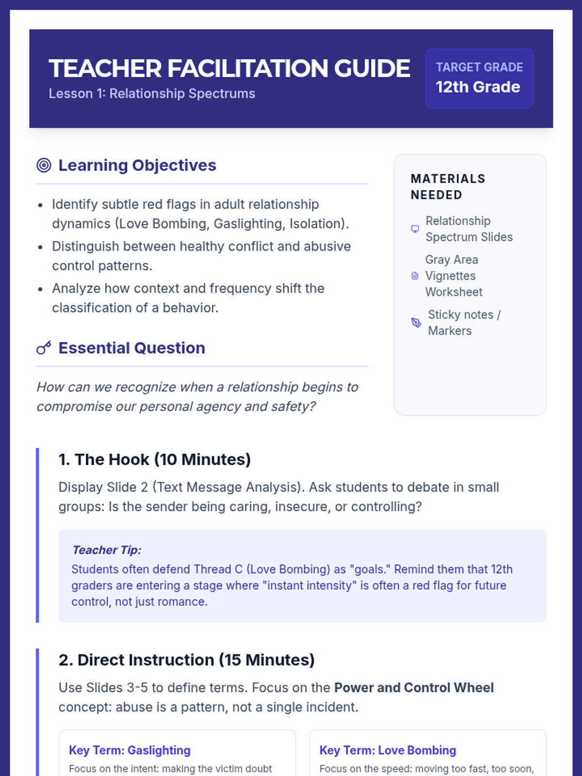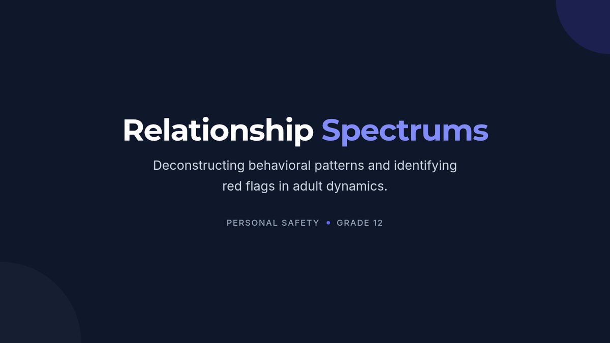 A comprehensive sequence for 12th-grade students focused on analyzing relationship dynamics, understanding the nuances of consent and power, managing digital boundaries, and developing assertive communication skills for personal safety in adult environments.