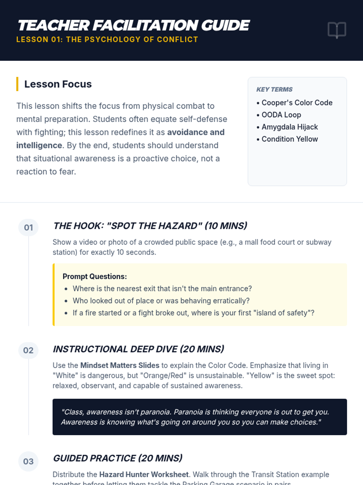 This sequence shifts focus from physical combat to the mental and verbal aspects of self-defense, prioritizing conflict avoidance. Students learn threat assessment, assertive communication, and environmental scanning through Cooper's Color Code and role-playing scenarios.
