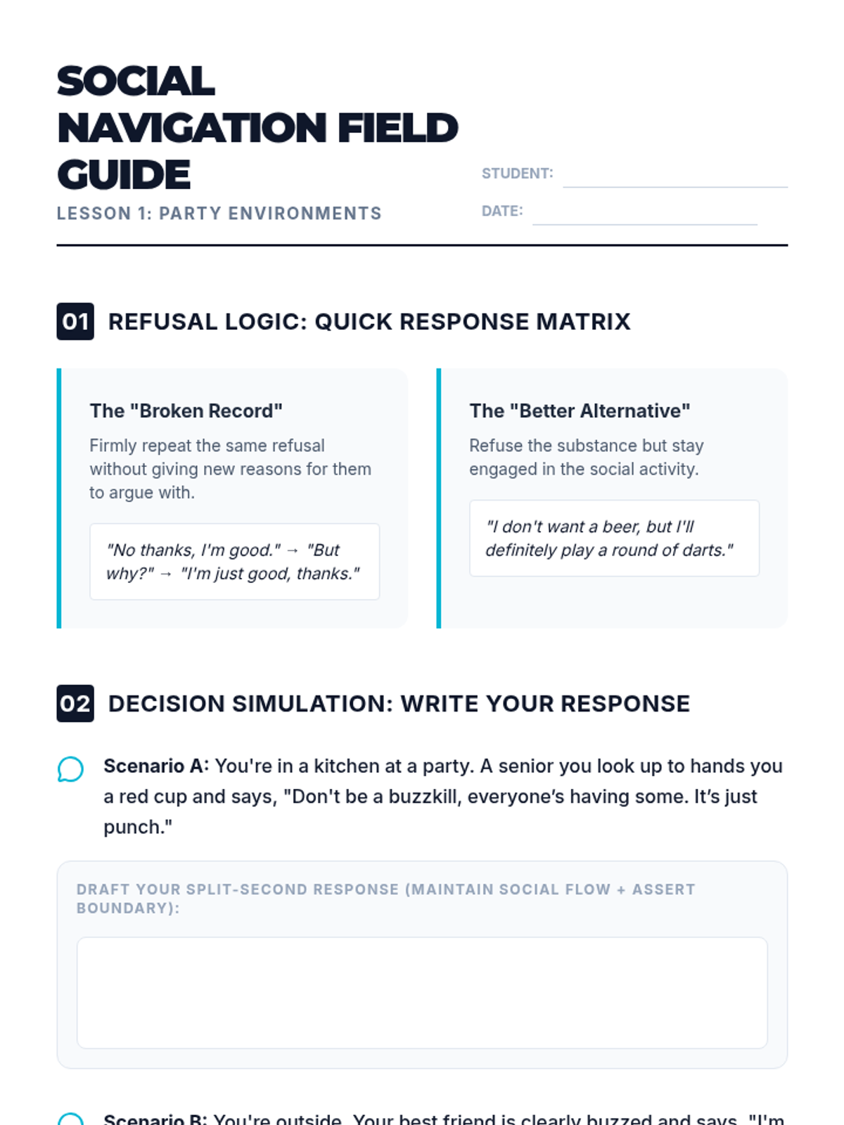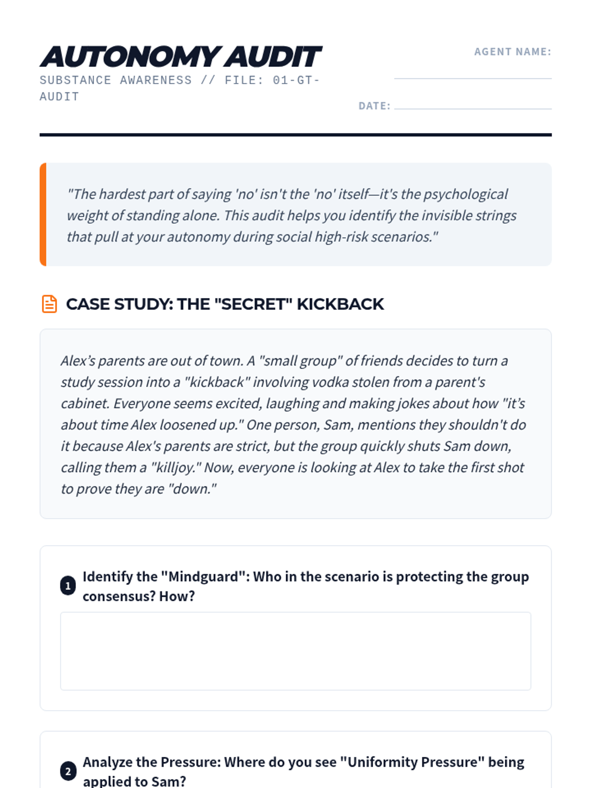 A high-level psychological and sociological exploration of peer influence, group dynamics, and the neuroscience of adolescent decision-making. Students move beyond refusal scripts to analyze the mechanics of manipulation and groupthink, culminating in a personalized resistance strategy.