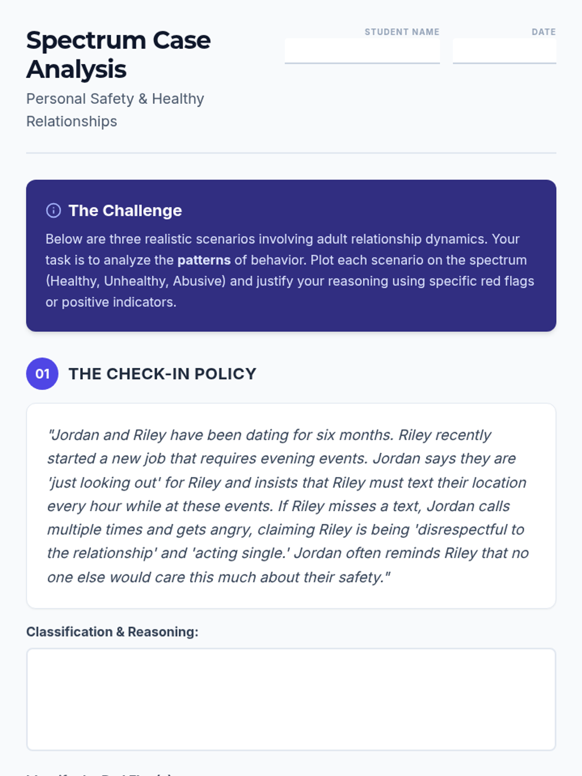 A comprehensive unit for 12th graders exploring consent, assertive communication, digital privacy, and bystander intervention to prepare them for adult relationships. Students will move from theoretical understanding to practical application through role-plays and case studies.