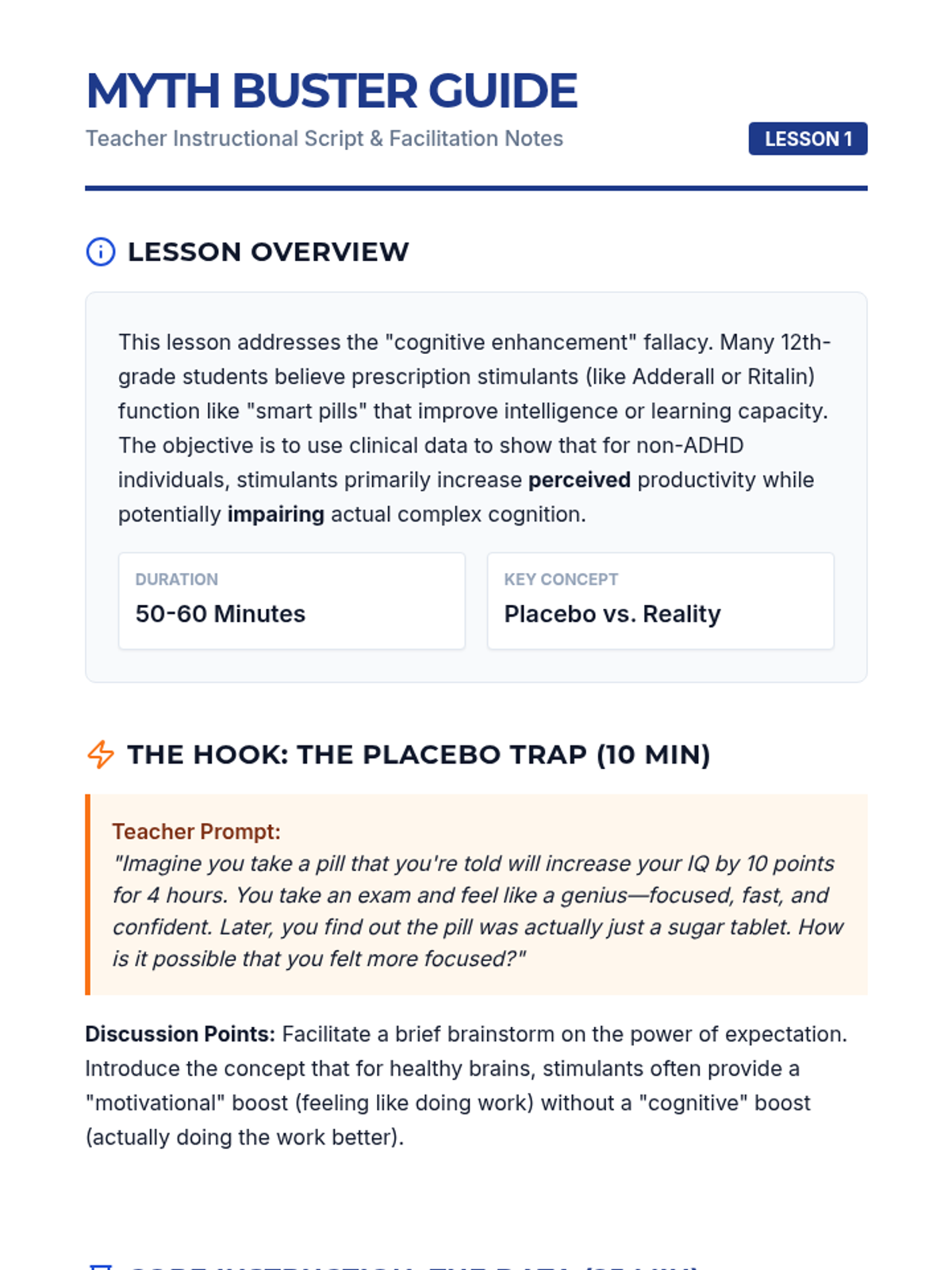 This comprehensive unit for 12th-grade students explores the physiological, psychological, and legal realities of prescription stimulant misuse. It deconstructs the 'study drug' myth, analyzes the risks of Schedule II substances, and equips students with practical stress management and refusal skills.