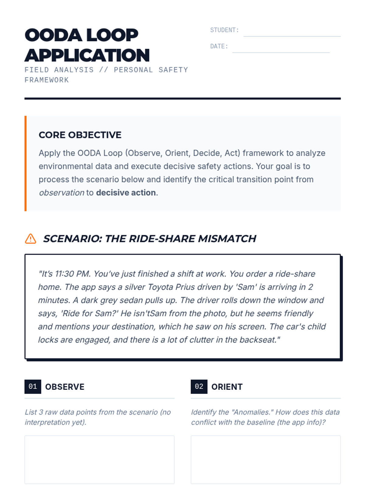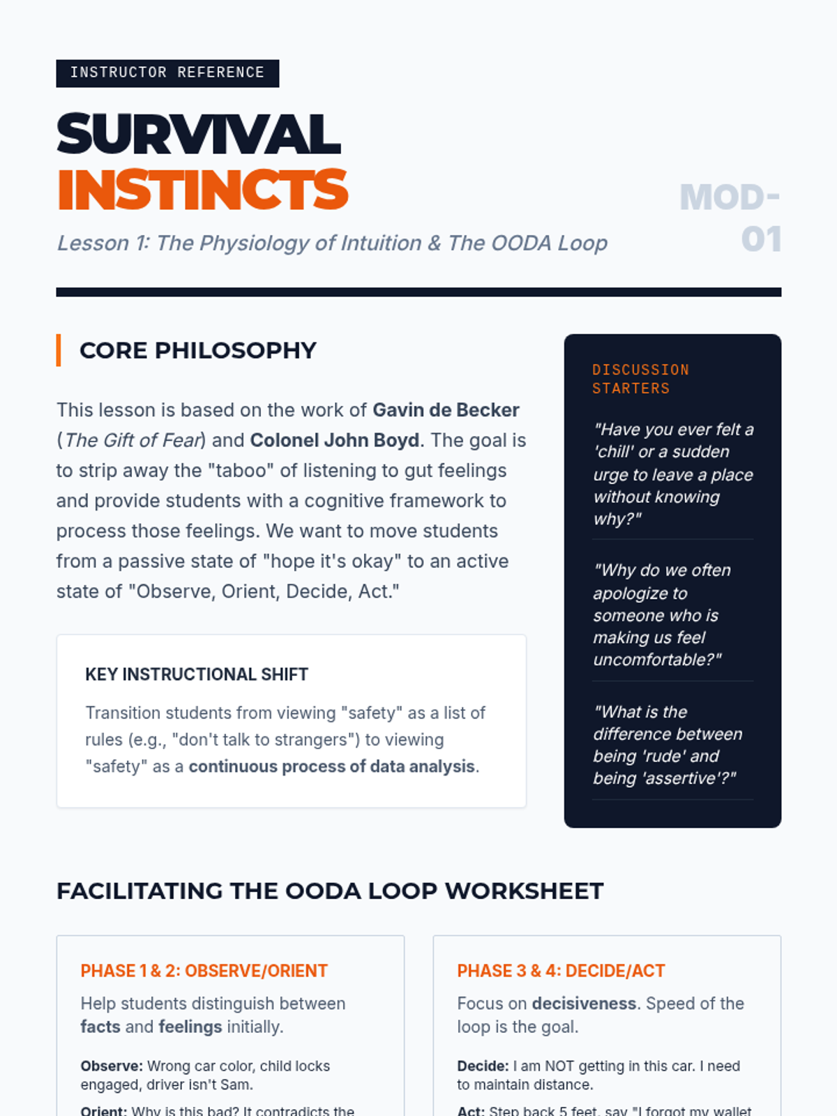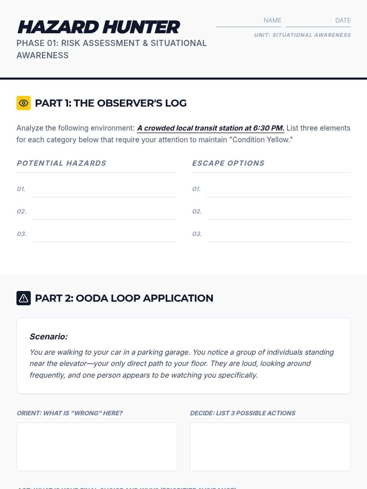 A comprehensive safety sequence for graduating seniors focusing on situational awareness, the OODA loop framework, and recognizing predatory social behaviors in physical and digital spaces.