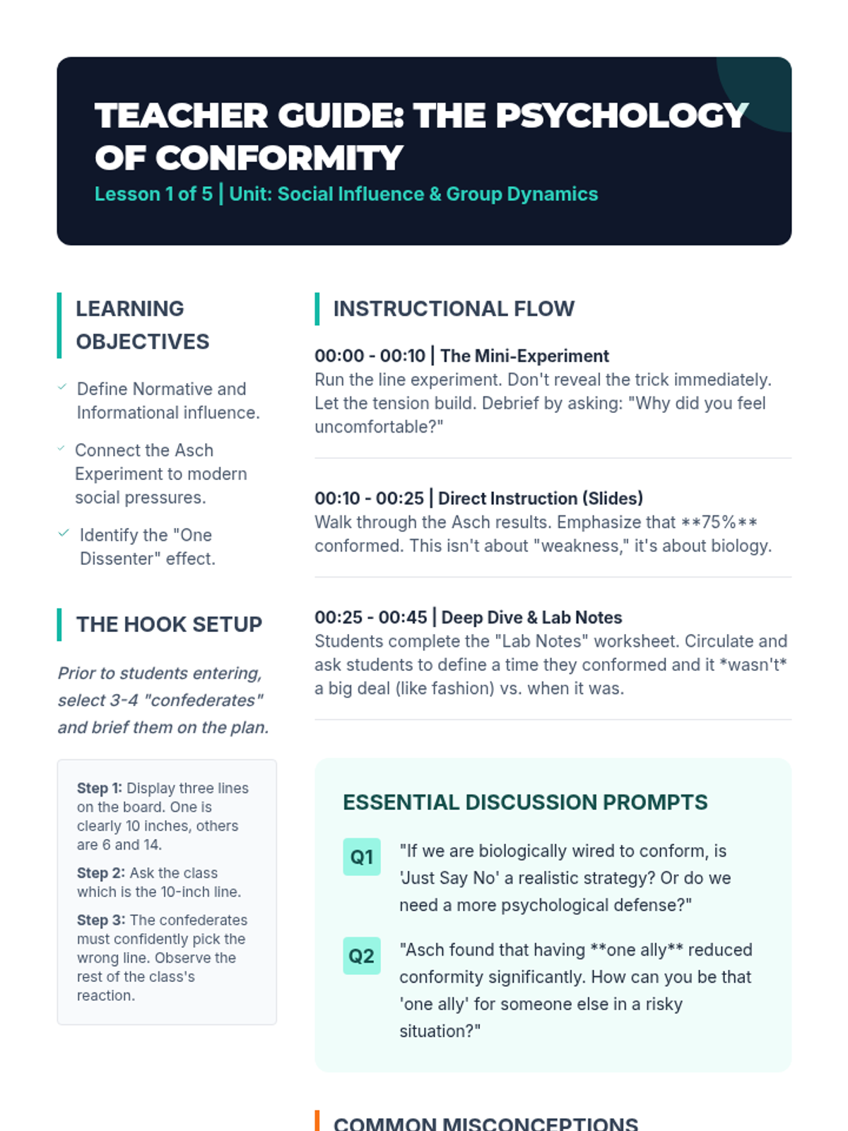 This sequence explores the psychological and social mechanisms behind peer pressure and substance use for 12th-grade students. By analyzing classic conformity experiments, manipulation tactics, digital influence, and groupthink, students develop a high-level cognitive framework for maintaining individual autonomy.