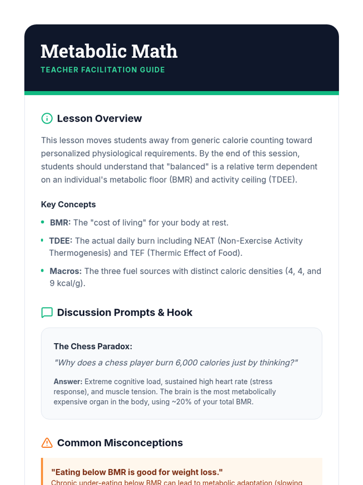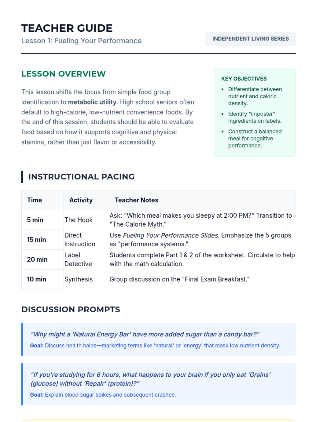 This sequence prepares high school seniors for the nutritional challenges of independent living, moving from complex nutrient analysis to practical budgeting, portion control, and meal prep strategies. Students will develop the critical thinking skills needed to maintain health and performance while managing limited time, money, and kitchen facilities.