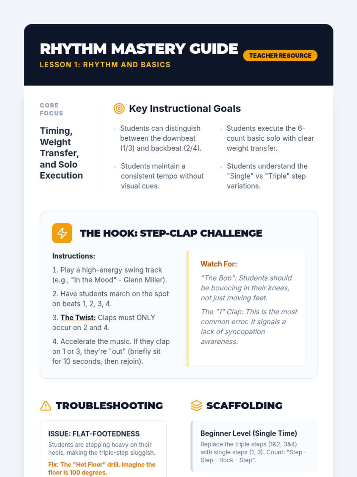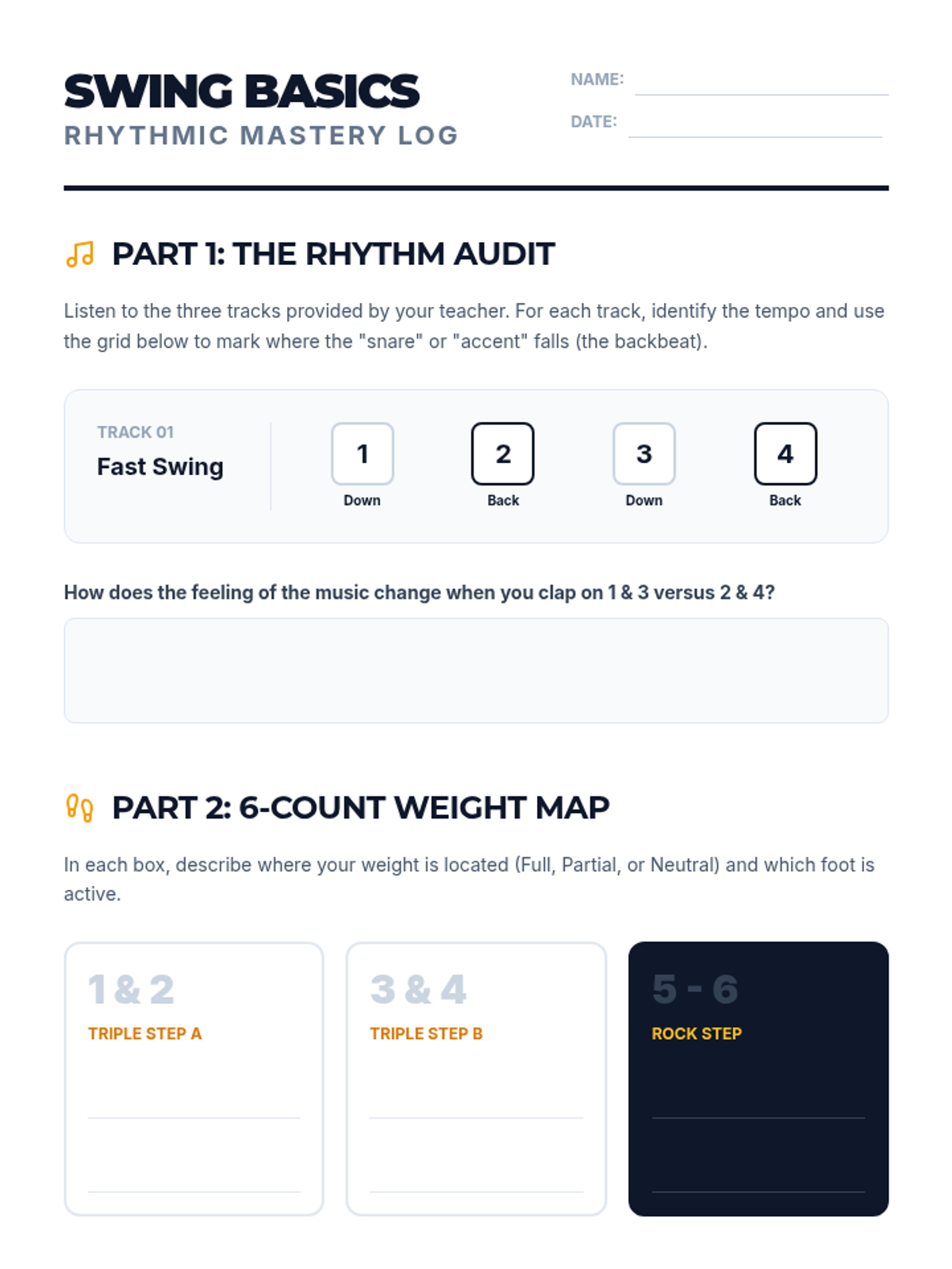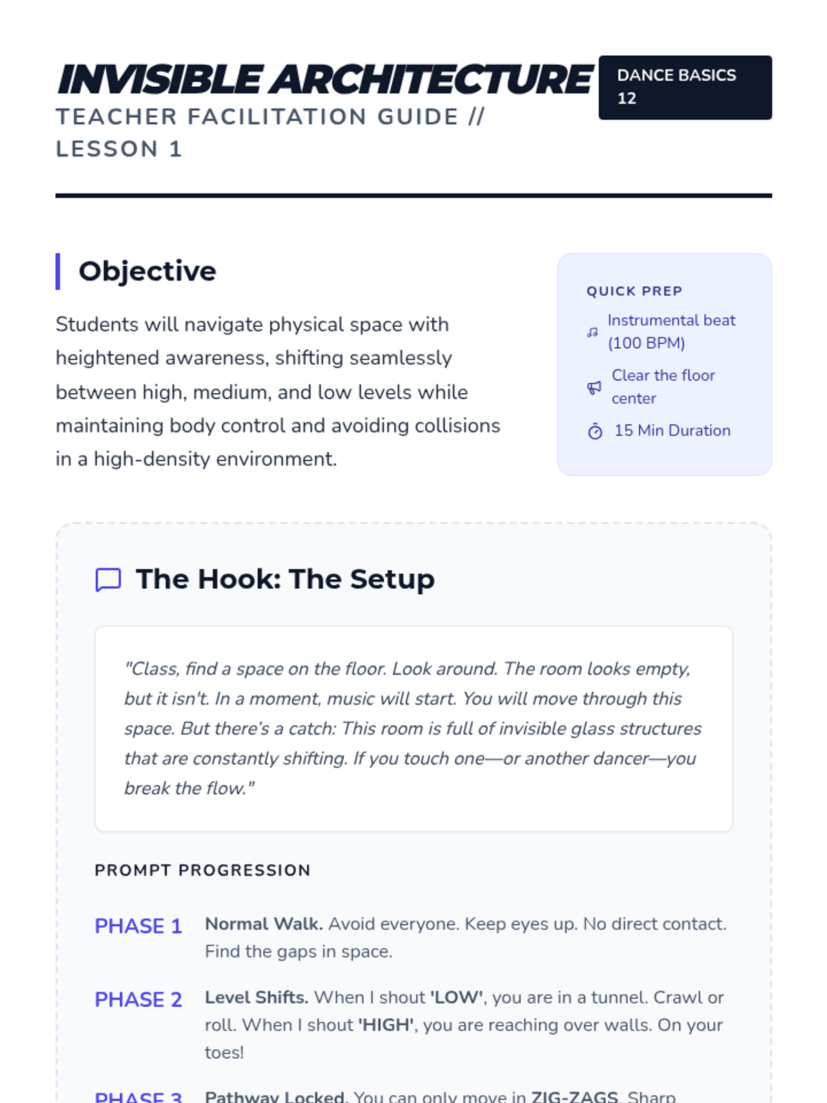 A comprehensive 5-lesson unit for 12th graders focusing on the mechanics, etiquette, and social dynamics of partner dancing, specifically East Coast Swing. Students progress from basic rhythmic footwork to complex lead-follow connection and floorcraft.