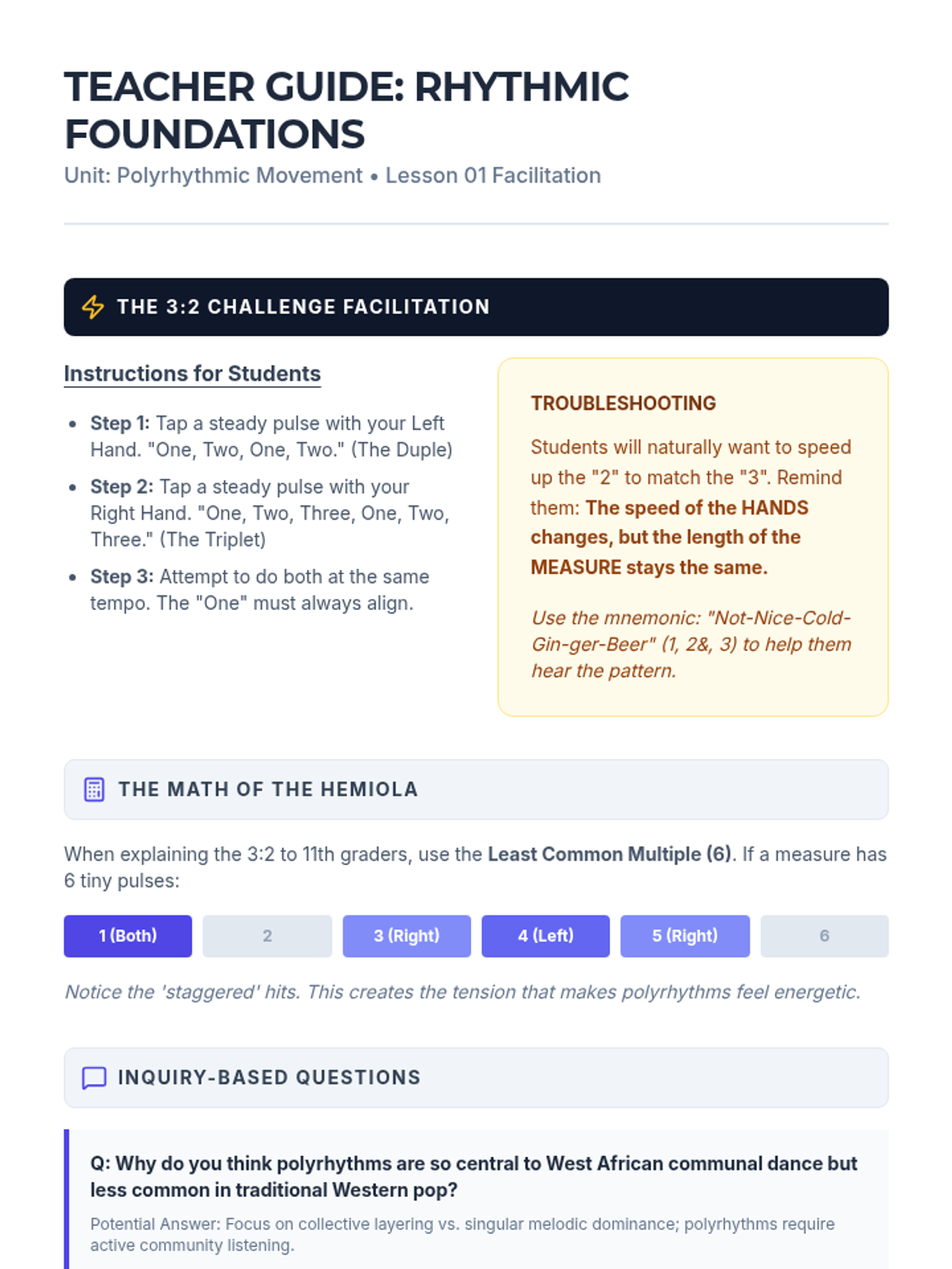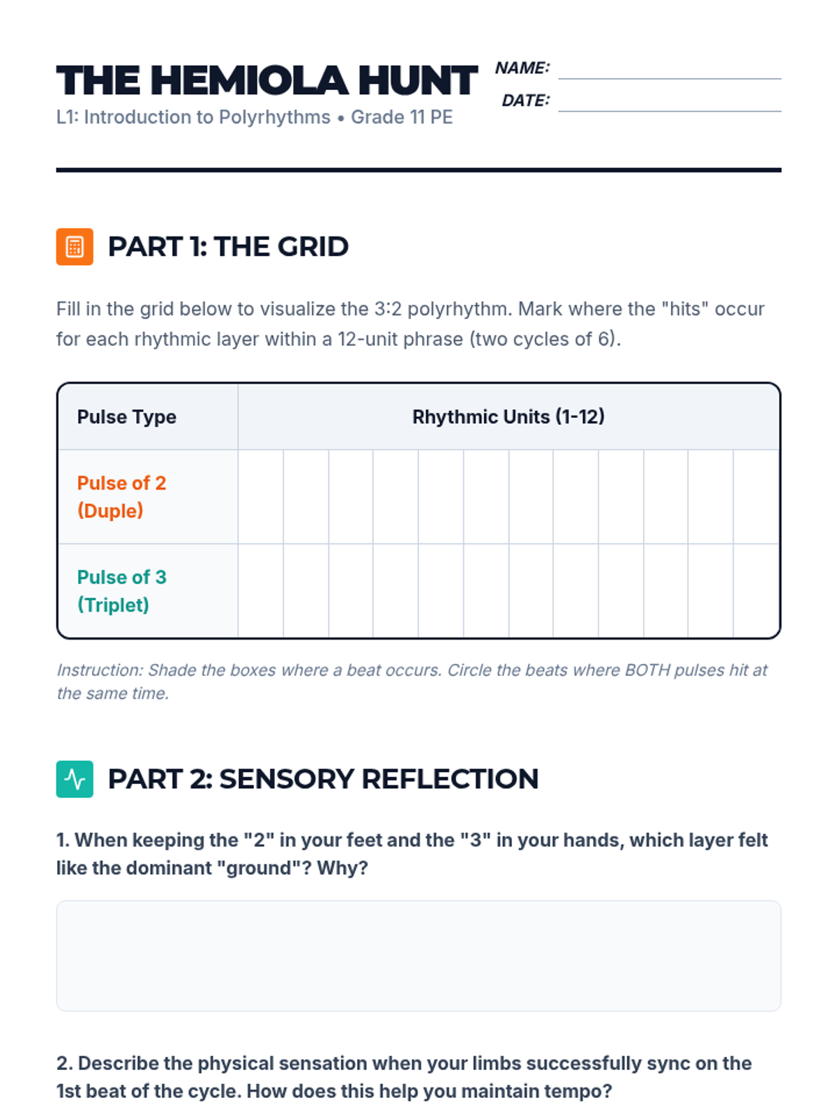 A high-level physical education sequence for 12th graders focusing on the intersection of music theory and movement. Students progress from basic beat identification to complex polyrhythmic coordination and body percussion.