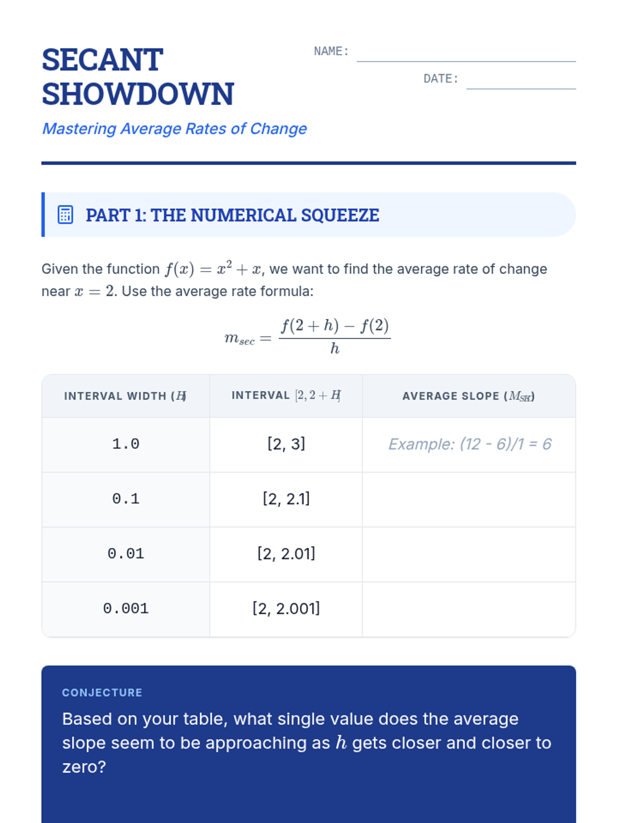 A comprehensive introduction to the formal definition of the derivative, moving from the algebraic construction of the difference quotient to the rigorous limit definition. Students explore differentiability, continuity, and notation fluency.