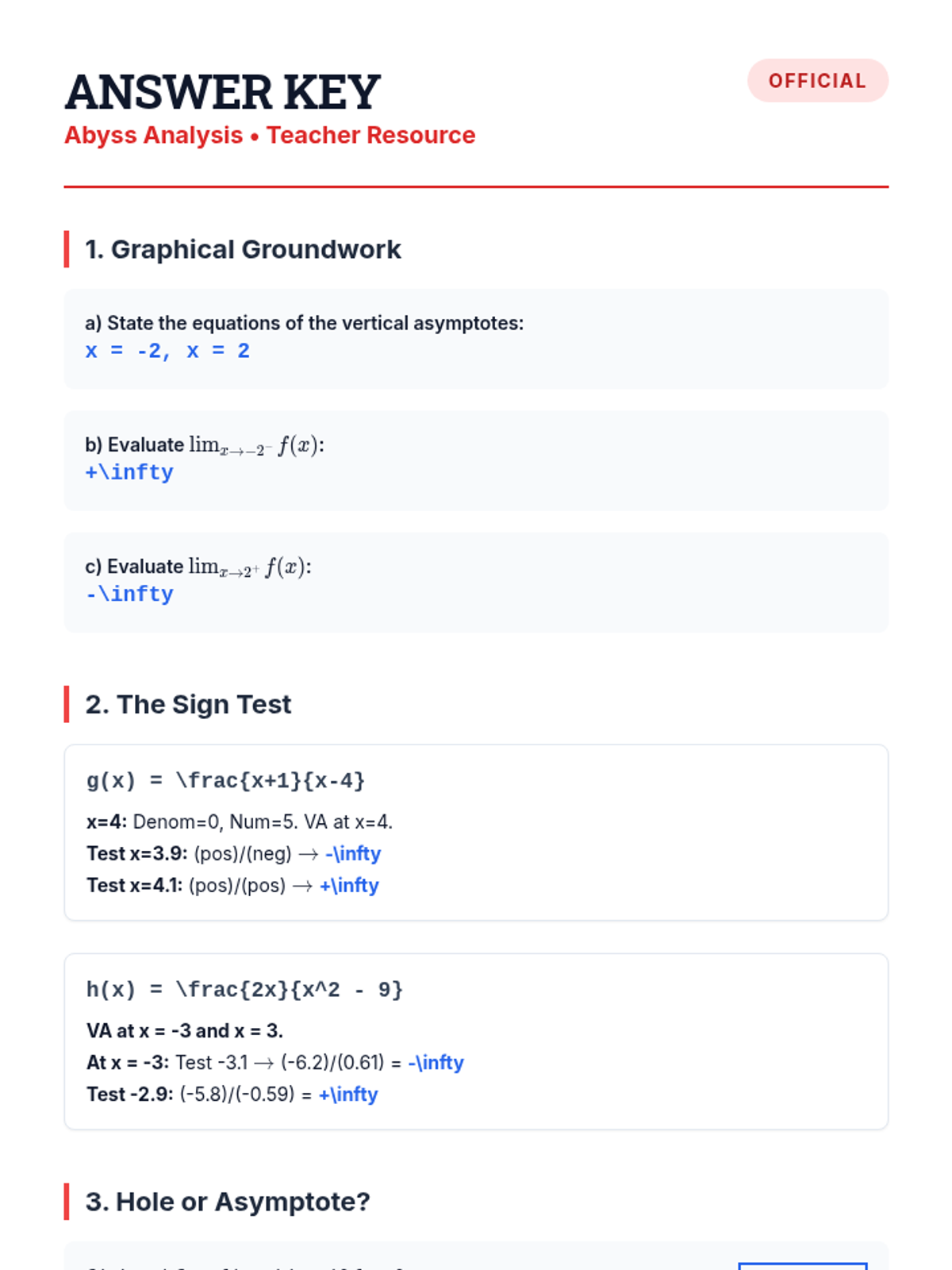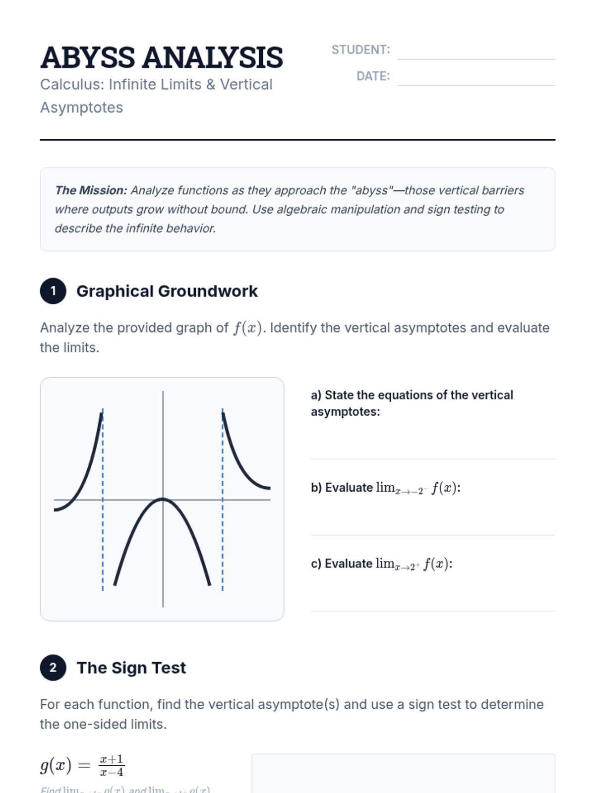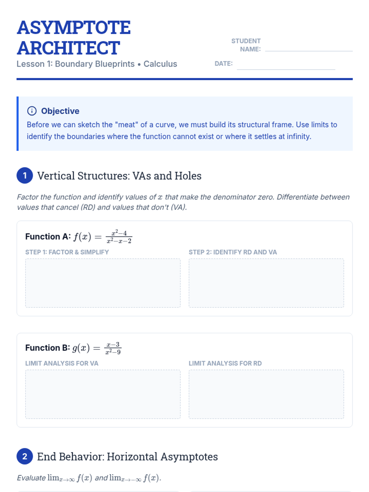 A comprehensive 12th-grade Calculus unit exploring function behavior as variables approach infinity or asymptotes. Students master vertical, horizontal, and slant asymptotes, apply limits to real-world modeling, and bridge the gap to derivatives.